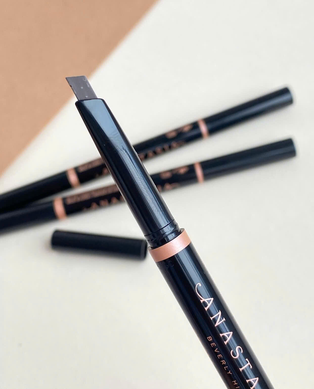 Bắt đầu bằng cách chỉ lấy một lượng nhỏ sản phẩm (khoảng 2-3 milimet); điều này giúp bạn kiểm soát bút chì tốt nhất và tránh lem khi kẻ. Hãy nhớ rằng tất cả các sản phẩm của Anastasia Beverly Hills đều có độ lên màu cao, vì vậy chỉ cần ấn nhẹ là đủ.