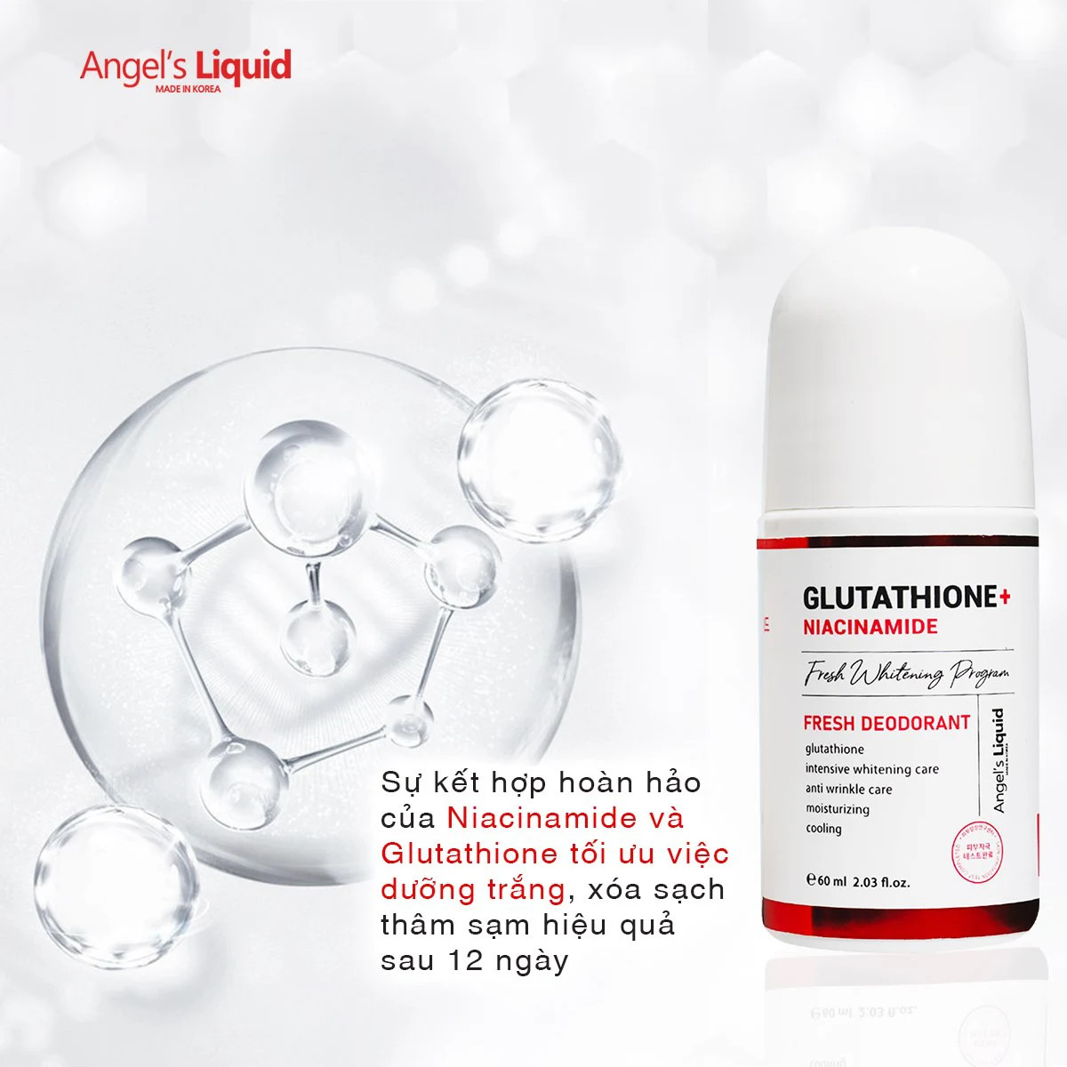 Lăn Vùng Nách Angel’s Liquid Glutathione Plus Niacinamide Arbutin Mờ Thâm Dưỡng Trắng là sản phẩm lăn khử mùi đến từ thương hiệu mỹ phẩm Angel's Liquid của Hàn Quốc, không chỉ có diện mạo mới mà còn đột phá với công dụng dưỡng sáng gấp đôi: tăng cường hàm lượng Niacinamide 5% kết hợp với Arbutin 2% giúp đẩy nhanh tốc độ dưỡng sáng gấp 5 lần, hỗ trợ khử thâm nhanh chóng.