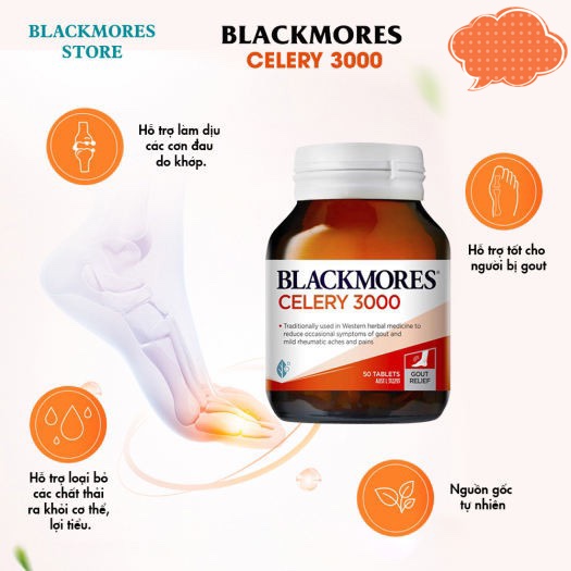 Gout hay còn gọi là Thống Phong. Đây là bệnh do quá trình bài tiết và hấp thụ đạm ở cơ thể bị rối loạn. Dẫn đến việc làm tăng nồng độ acid uric trong máu lên cao. Do đó người bị bệnh gout nên hạn chế các sản phẩm có hàm lượng purin và nồng độ đạm cao. Như thịt nội tạng (gan, thận, não, tim, thịt cừu rán), xúc xích, pate, hải sản, cá, những thực phẩm có màu đỏ. Bên cạnh đó người bệnh nên bổ sung thêm các sản phẩm giúp giảm lượng acid uric trong máu xuống. \n \nViên uống trị gout Blackmores Celery 3000 có thành phần chính là Apium Graveolens hay còn gọi là cần tây. Loại thảo dược này đã được nghiên cứu và chứng minh rằng có khả năng chống viêm, giảm đau, cũng như tính lợi tiểu đáng kể.