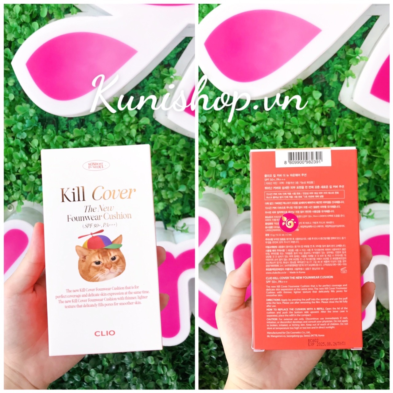 - Phấn Nước Clio Kill Cover The New Founwear Cushion SPF 50+ PA+++ (Koshort in Seoul Limited) che phủ các vấn đề về da cùng một lúc (từ những làn da đang ửng đỏ đến trường hợp có các khuyết điểm thâm sạm) với độ che phủ tuyệt vời, giúp lấp đầy lỗ chân lông, các rãnh cười một cách tinh tế, mang đến lớp nền bán lì hoản hảo mịn màng, mỏng nhẹ như không.