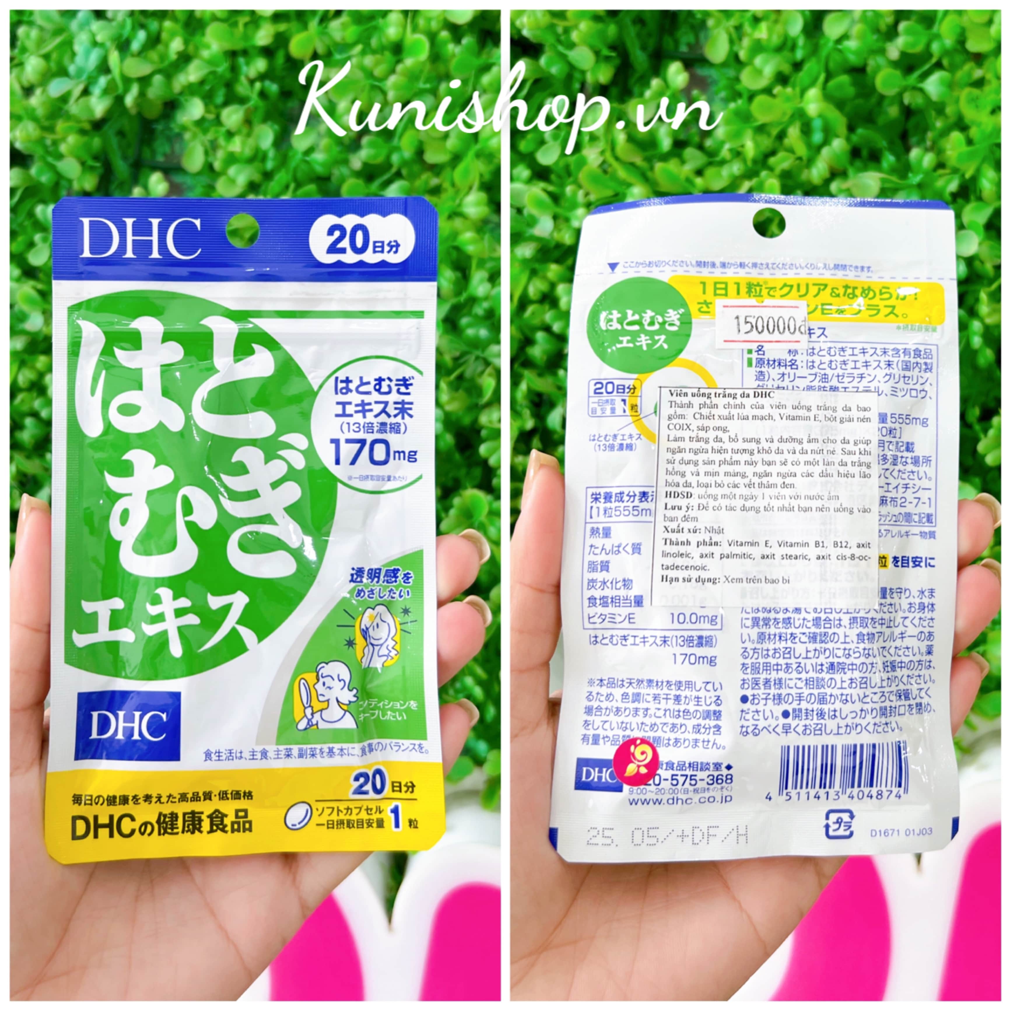 Viên uống trắng da Coix Extract DHC được chiết xuất từ hạt Coix, là một loại thảo dược mọc quanh năm ở khu vực Đông Dương có tác dụng làm trắng da, bổ sung và dưỡng ẩm cho da giúp ngăn ngừa hiện tượng khô da và da nứt nẻ. Viên uống trắng da DHC với các dưỡng chất như Vitamin E, Vitamin B1, B12, axit linoleic, axit palmitic, axit stearic, axit cis-8-oc-tadecenoic … giúp ngăn ngừa nám da, làm mờ thâm sẹo, phục hồi tổn thương do tia UV gây ra, khôi phục lại sức sống cho làn da, tránh được tối đa sự hình thành những đốm nâu, tàn nhang, làm da bạn trắng hồng và mịn màng như da em bé.
