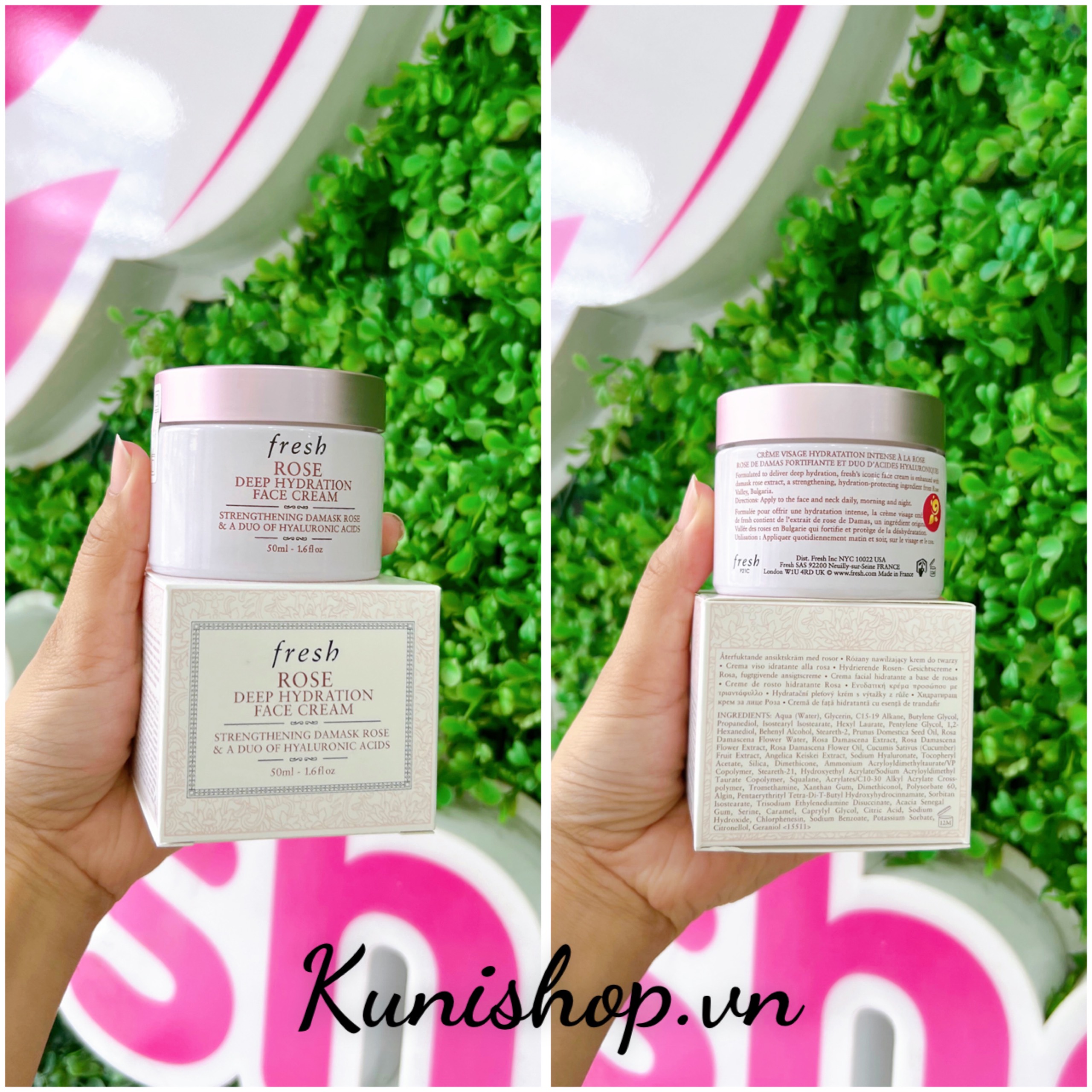 Kem dưỡng Fresh Rose là một loại kem dưỡng ẩm tuyệt vời, chất kem gel nhẹ kết hợp từ nước và dầu hoa hồng nhẹ nhàng nuôi dưỡng da và được mô tả là một sản phẩm có thể cung cấp độ ẩm mạnh mẽ lên đến 24 giờ . Một sự kết hợp tiên tiến của các axit hyaluronic giúp tăng độ ẩm cho hydrat hóa sâu để hỗ trợ độ đàn hồi da khỏe mạnh. Nước hoa hồng làm dịu da trong khi dầu hoa hồng nuôi dưỡng. Thành phần giàu vitamin E chống oxy hóa, loại kem mặt dịu nhẹ này cung cấp khả năng hydrat hóa không ngừng mỗi ngày. Thoa lên da thực sự mượt và hấp thụ rất nhanh chóng vào da , bạn sẽ cảm thấy da siêu mịn nhưng cũng vô cùng ngậm nước, mềm mại như một cánh hoa.