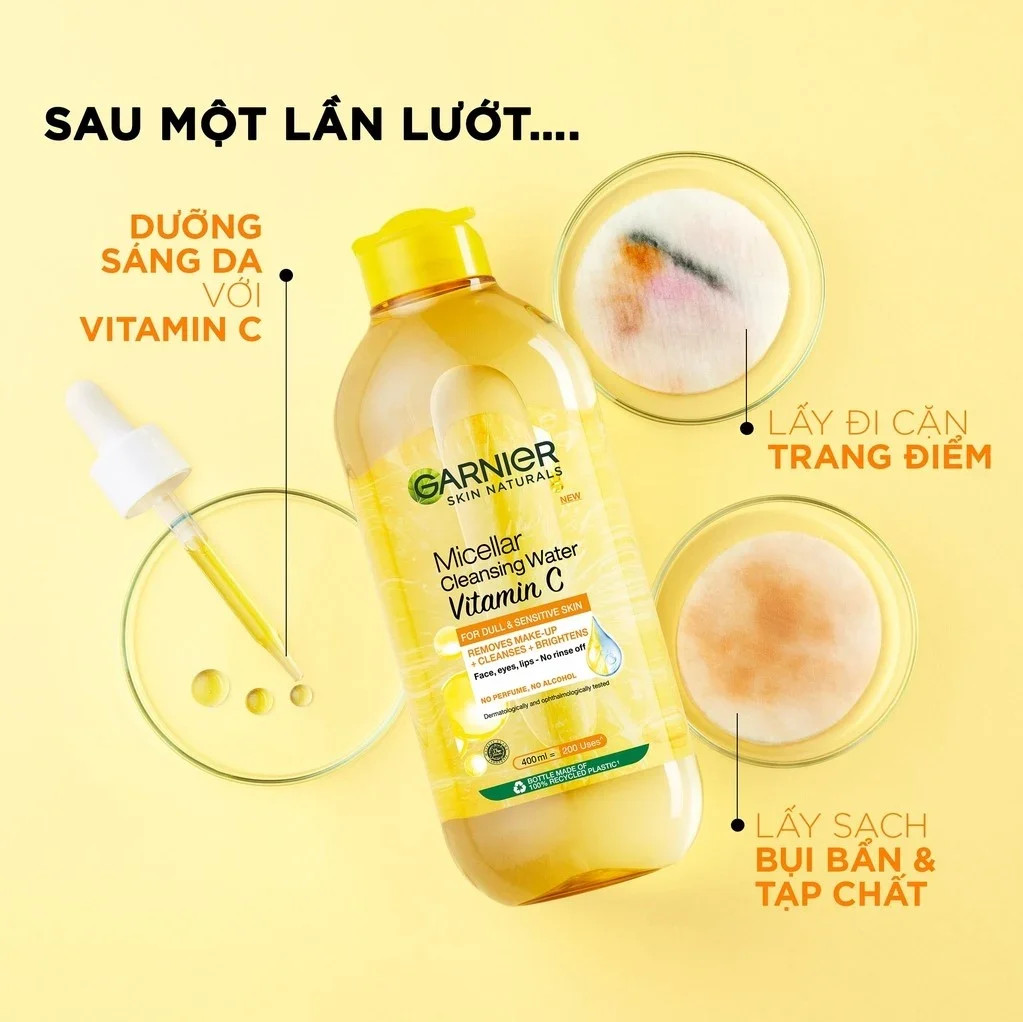 Lần đầu tiên, thương hiệu Garnier cho ra đời dòng sản phẩm nước tẩy trang mới với sự kết hợp giữa công nghệ Micelles (Micellar Technology) và thành phần làm sáng da Vitamin C – Garnier Vitamin C Micellar Water giúp loại bỏ lớp trang điểm và làm sạch da chỉ trong 1 lần sử dụng, mang lại làn da tươi sáng và rạng rỡ hơn tức thì.