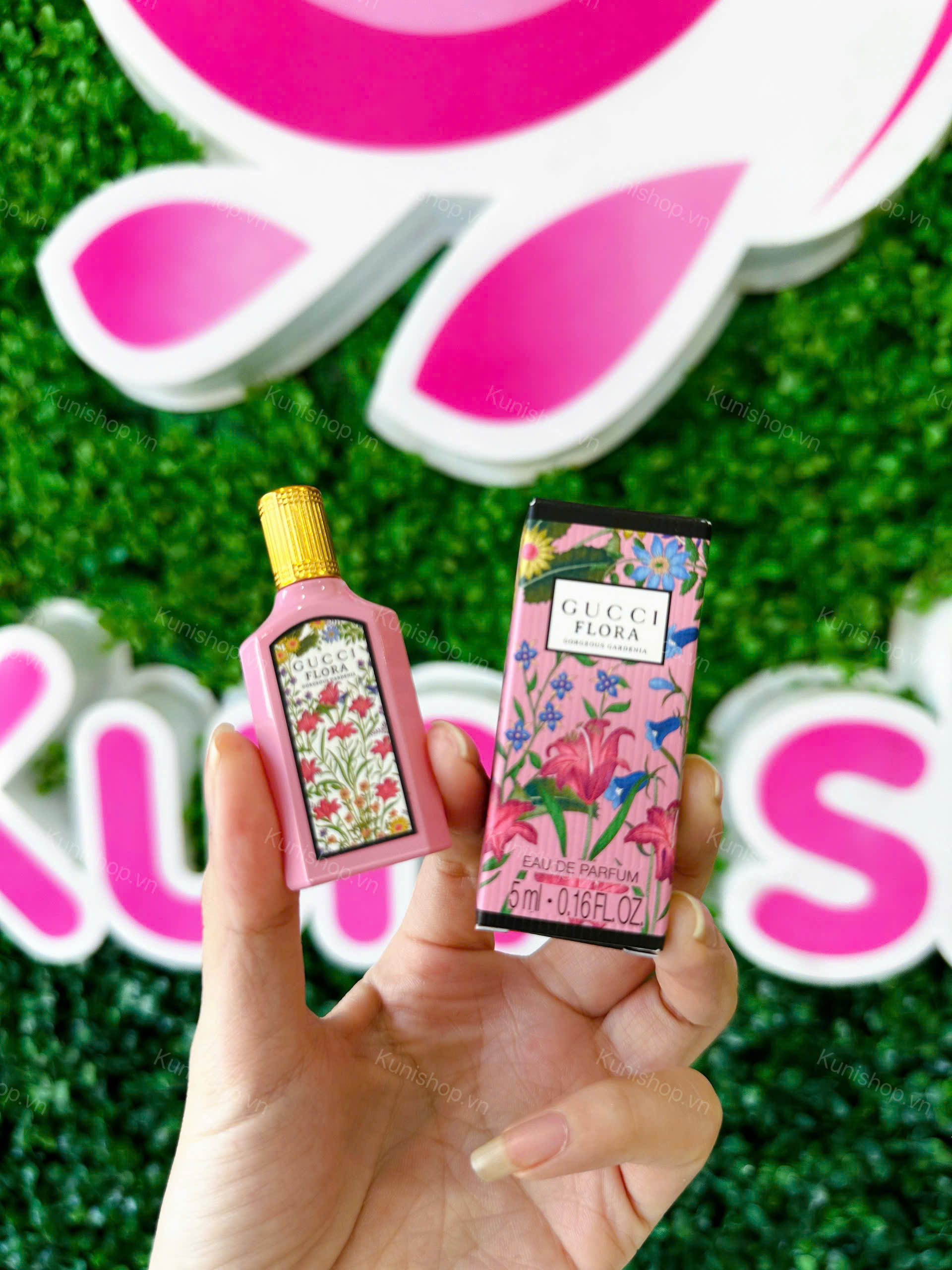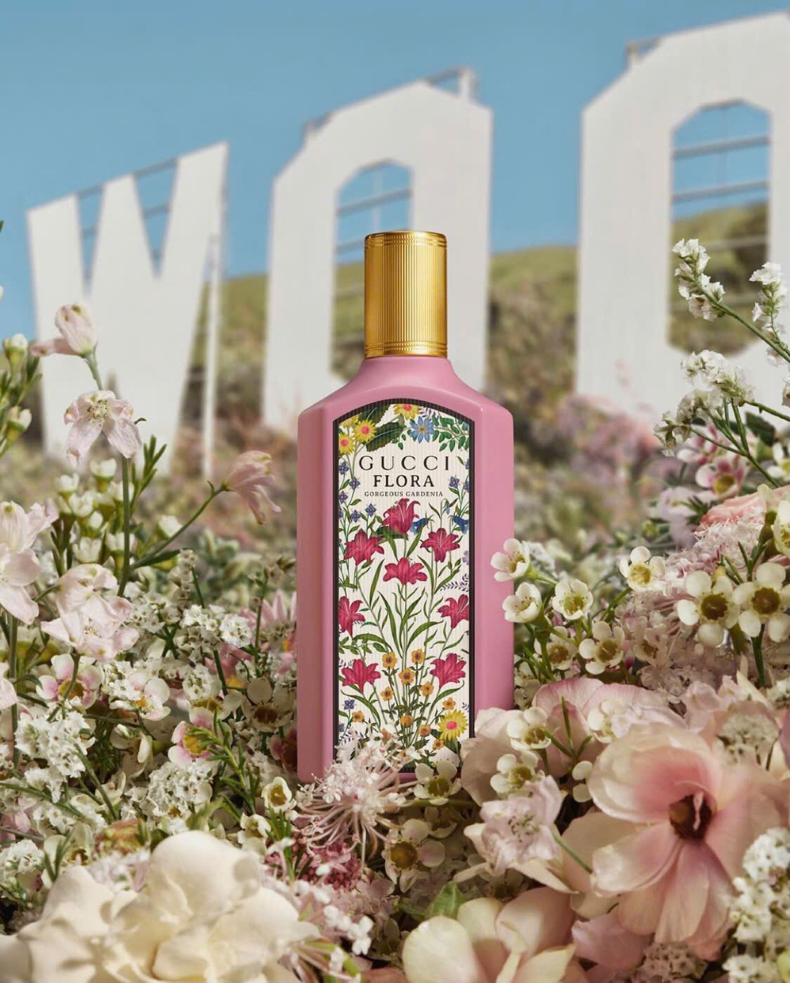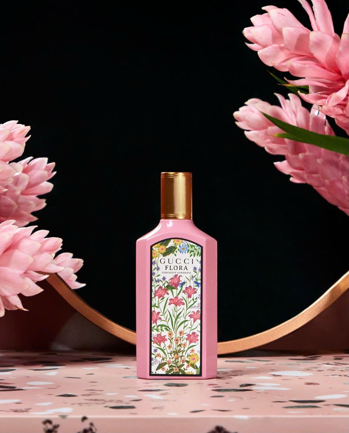 Được bao bọc trong một chai mới, dài, thủy tinh màu hồng sơn mài và nắp vàng sáng bóng. Một bổ sung đáng chú ý là hoa văn Flora đặc biệt, được tái tưởng tượng với thiết kế lấy cảm hứng từ tầm nhìn của Alessandro Michele. Một phần cốt lõi của bản sắc Gucci, họa tiết là bức tranh vẽ những bông hoa đầy màu sắc của nghệ sĩ Vittorio Accornero, được tạo ra cho Gucci vào năm 1966.