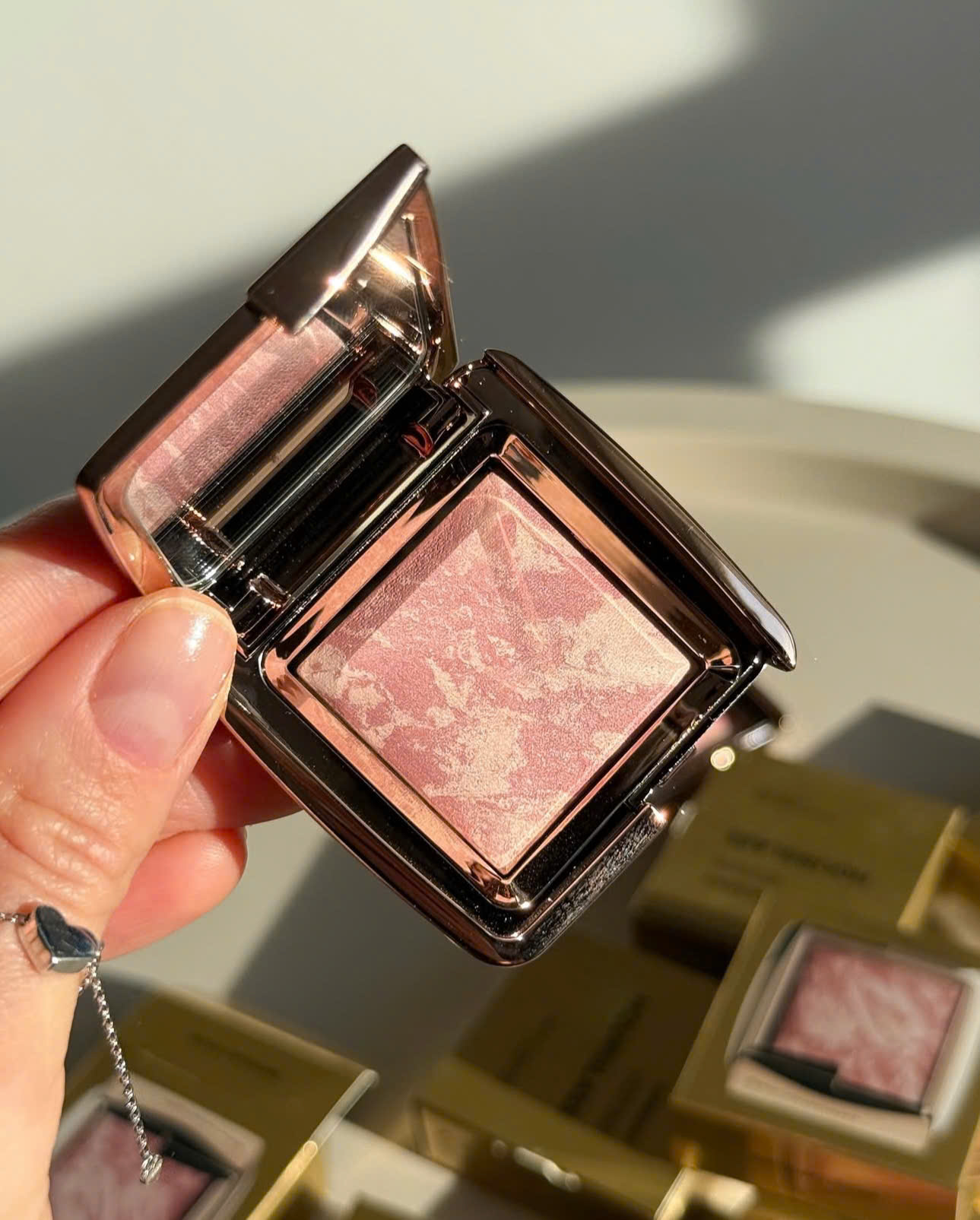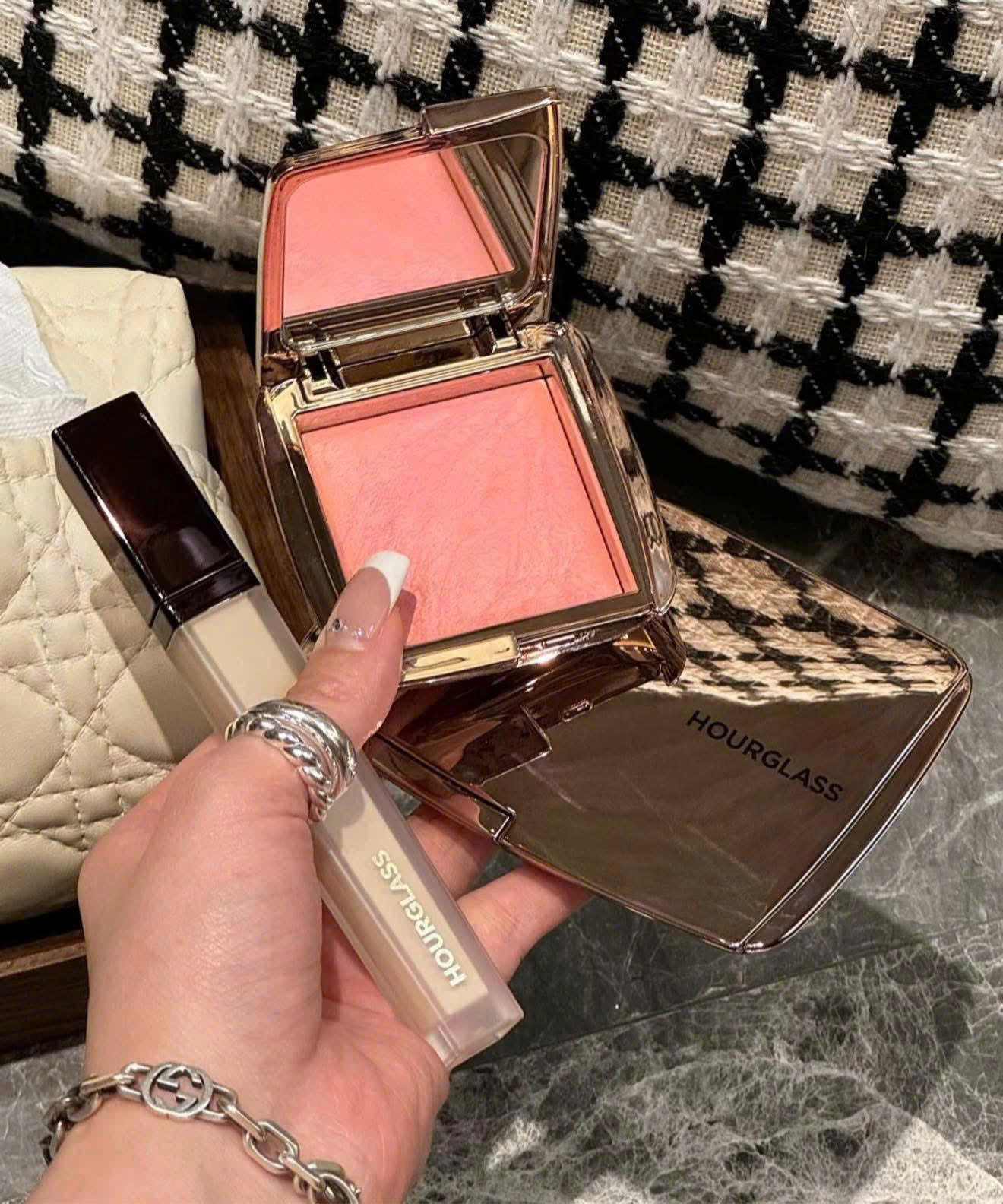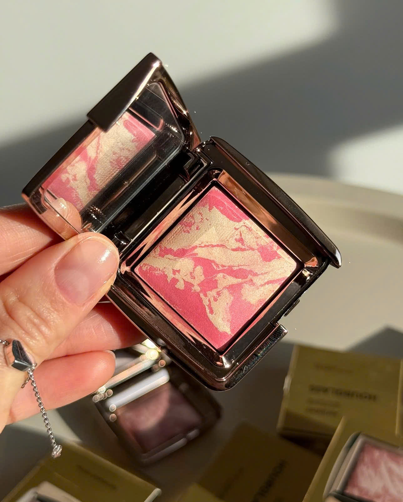 - Dùng cọ má hồng, lấy một lượng nhỏ Hourglass Lighting Blush.