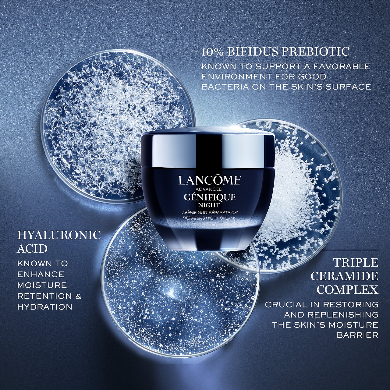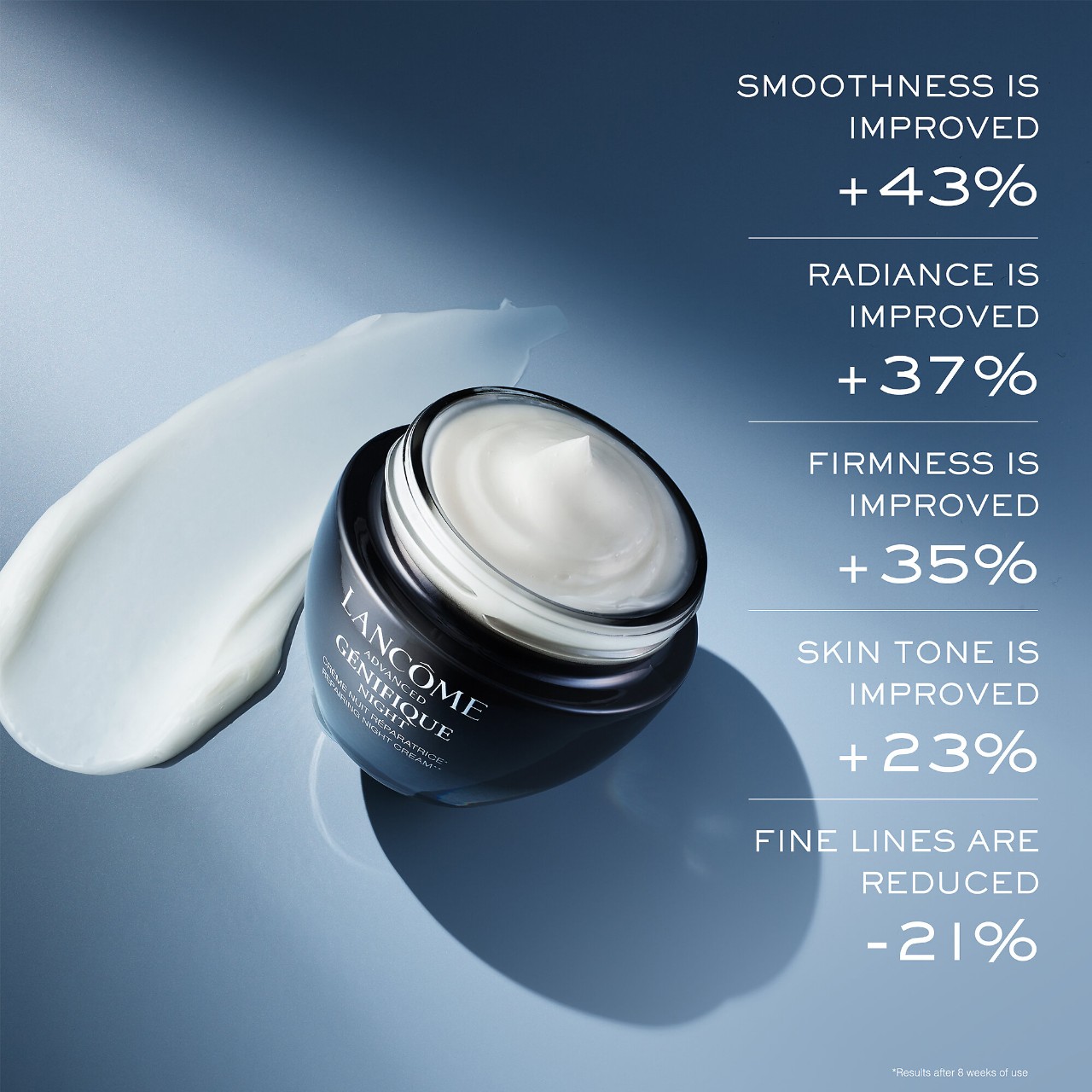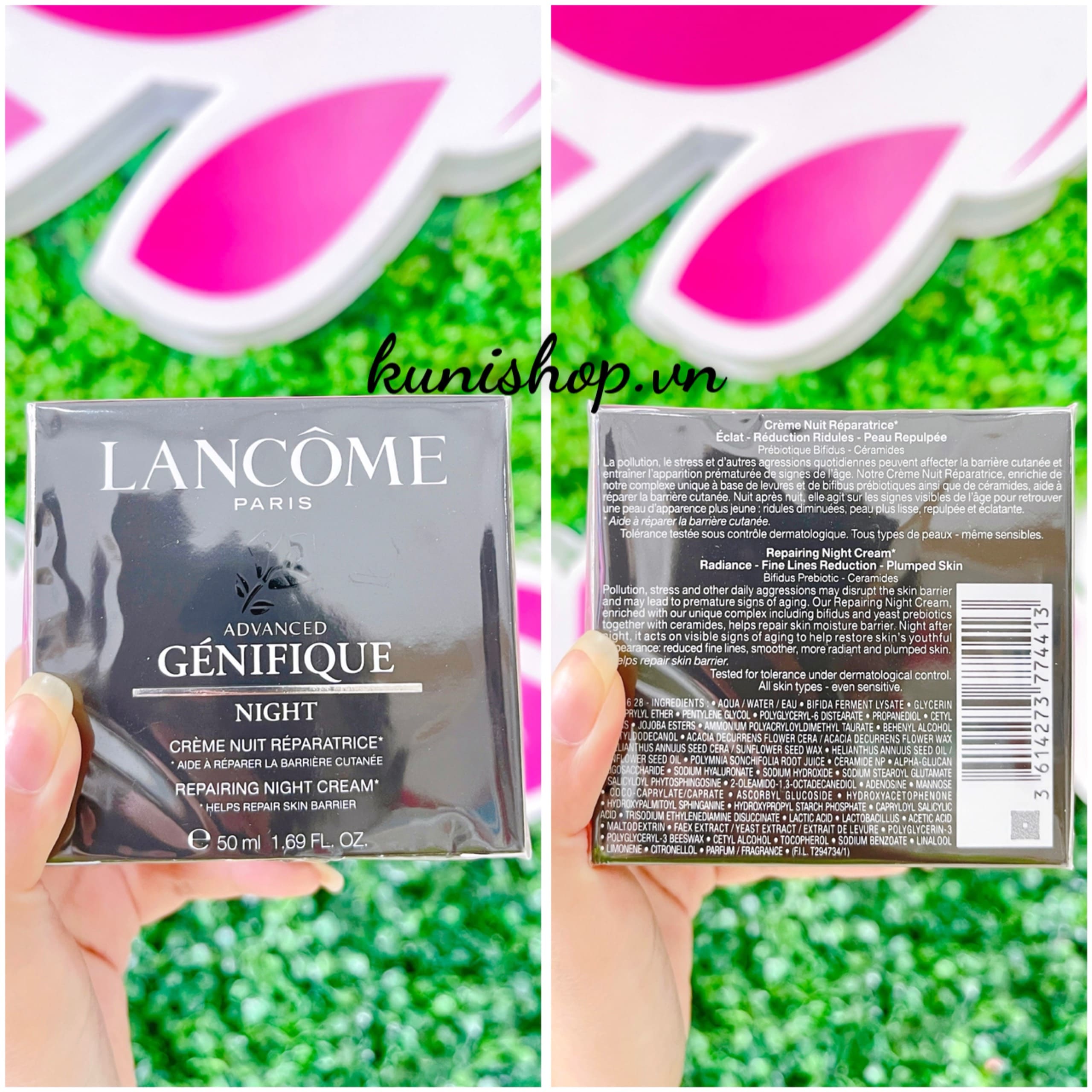 Genifique Night Repair Cream là sản phẩm dưỡng da, ngừa lão hóa cao cấp đến từ thương hiệu làm đẹp Lancome nước Pháp. Đồng cảm và thấu hiểu với nỗi lo thời gian của mỗi người phụ nữ, Lancome đã sáng tạo nên 1 loại kem dưỡng với công dụng tối ưu trong việc tái tạo và trẻ hóa làn da. Chỉ sau 1 giấc ngủ sâu, làn da của bạn sẽ trở nên trẻ trung, căng mọng và tràn đầy sức sống hơn bao giờ hết. Kem dưỡng da Lancome Genifique Night Repair được hàng triệu phái đẹp tin dùng và trải nghiệm mỗi năm trên toàn thế giới. Sử dụng đều đặn từ 2 cho đến 4 tuần sẽ mang lại hiệu quả chăm sóc da đáng ngạc nhiên cho bạn