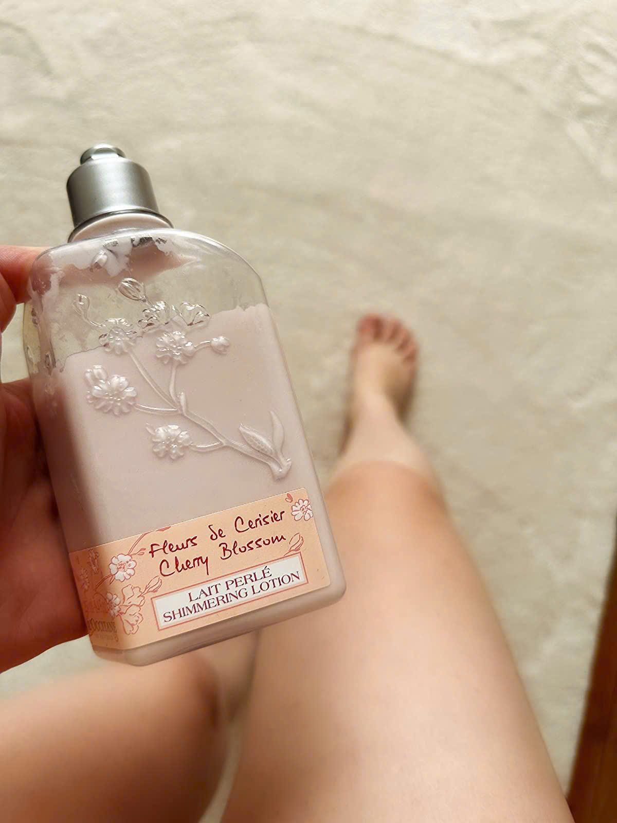 Thoa đều dưỡng thể L’Occitane Cherry Blossom Shimmering Lotion lên da và vỗ nhẹ để dưỡng chất hấp thụ.