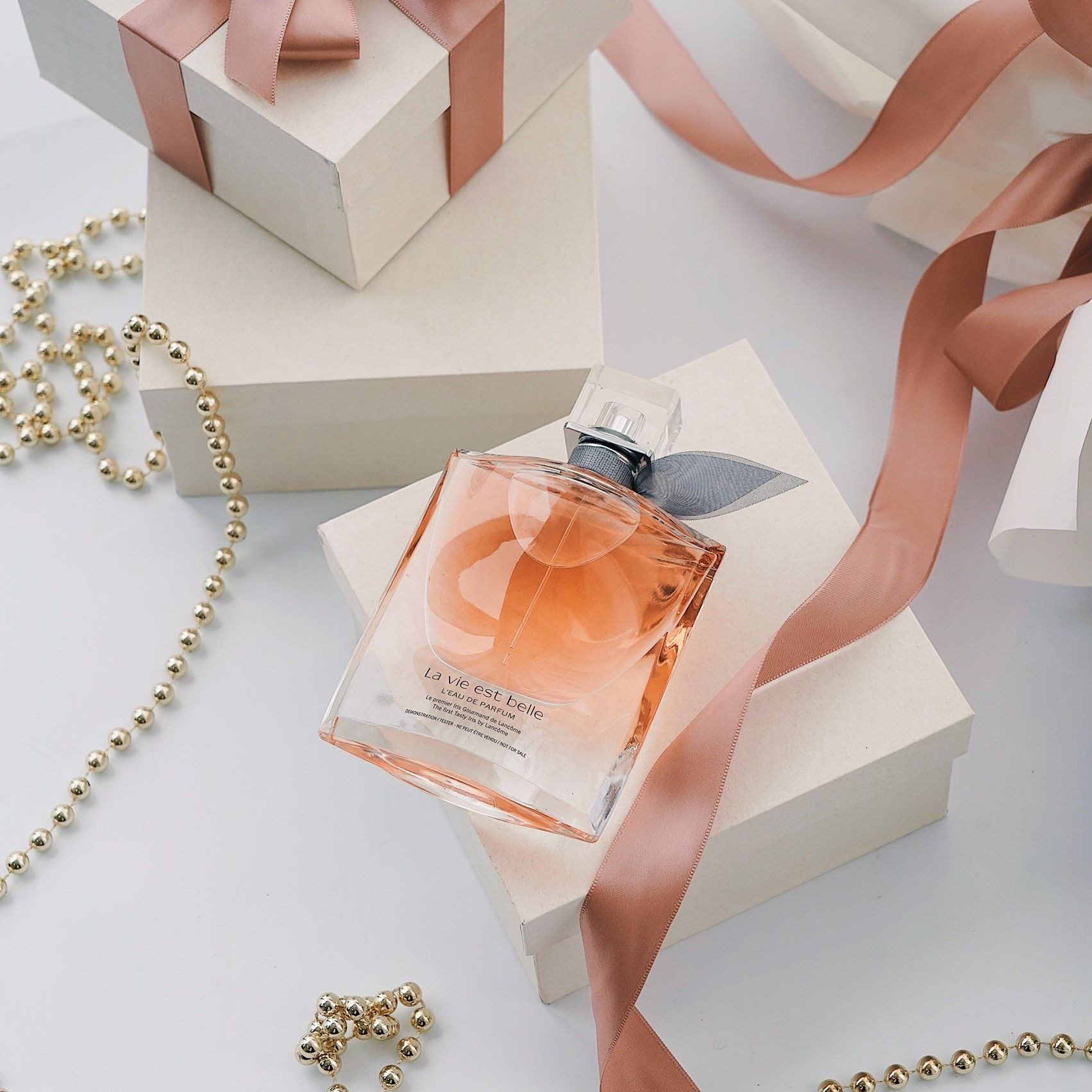 Lancome La Vie Est Belle EDP có thiết kế kiểu chai đơn giản dễ nhìn với chủ đạo màu hồng nhạt nữ tính, phụ kiện đi kèm là chiếc ruy bang màu xám thanh lịch tượng trưng một cô gái với chiếc khăn lụa thời trang.