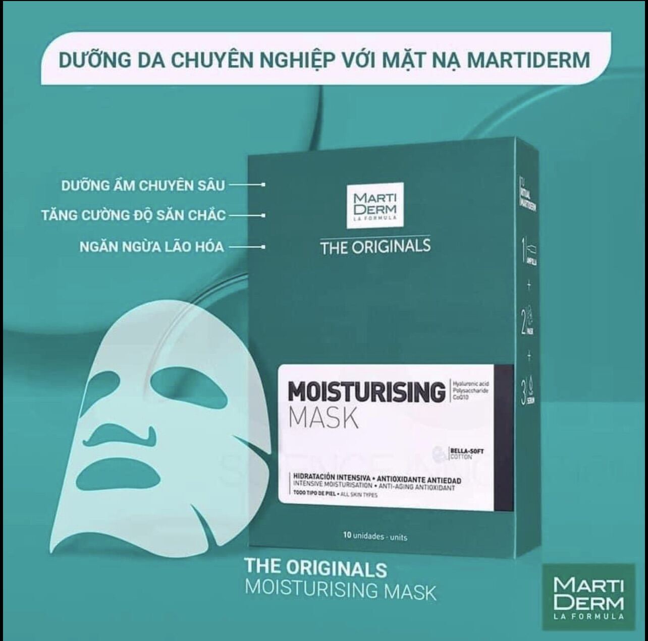 MartiDerm The Originals Moisturising Mask là mặt nạ dưỡng ẩm chuyên sâu dành cho những làn da khô mất nước, với thành phần Hyaluronic Acid và Coenzyme Q10, không chỉ dưỡng ẩm cho da trở nên ẩm mượt và căng mịn mà còn cải thiện kết cấu da, cải thiện độ đàn hồi và săn chắc, làm giảm nếp nhăn và các dấu hiệu lão hoá da, đồng thời tăng cường chức năng của hàng rào bảo vệ tự nhiên, mang lại làn da khoẻ mạnh và tràn đầy sức sống.
