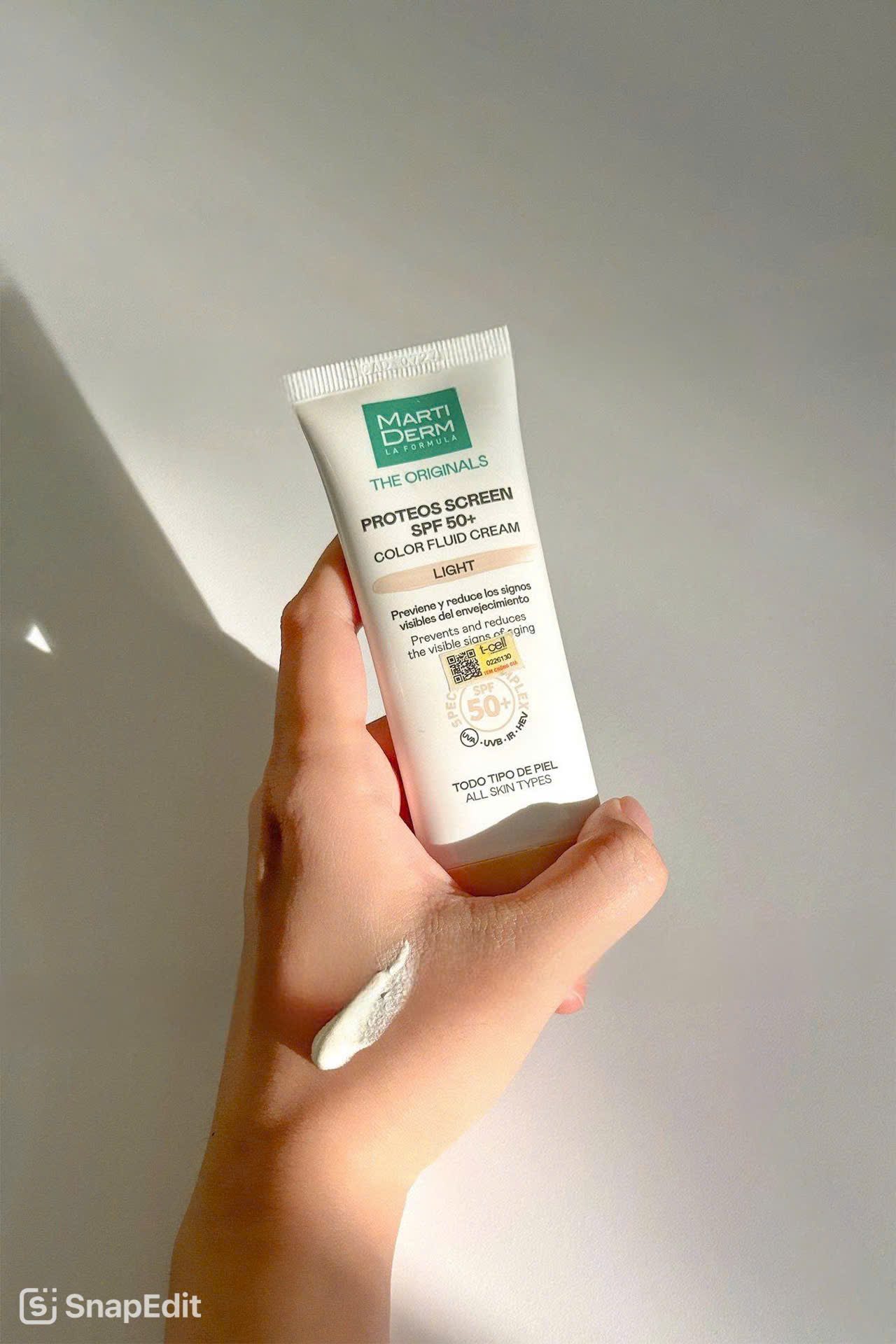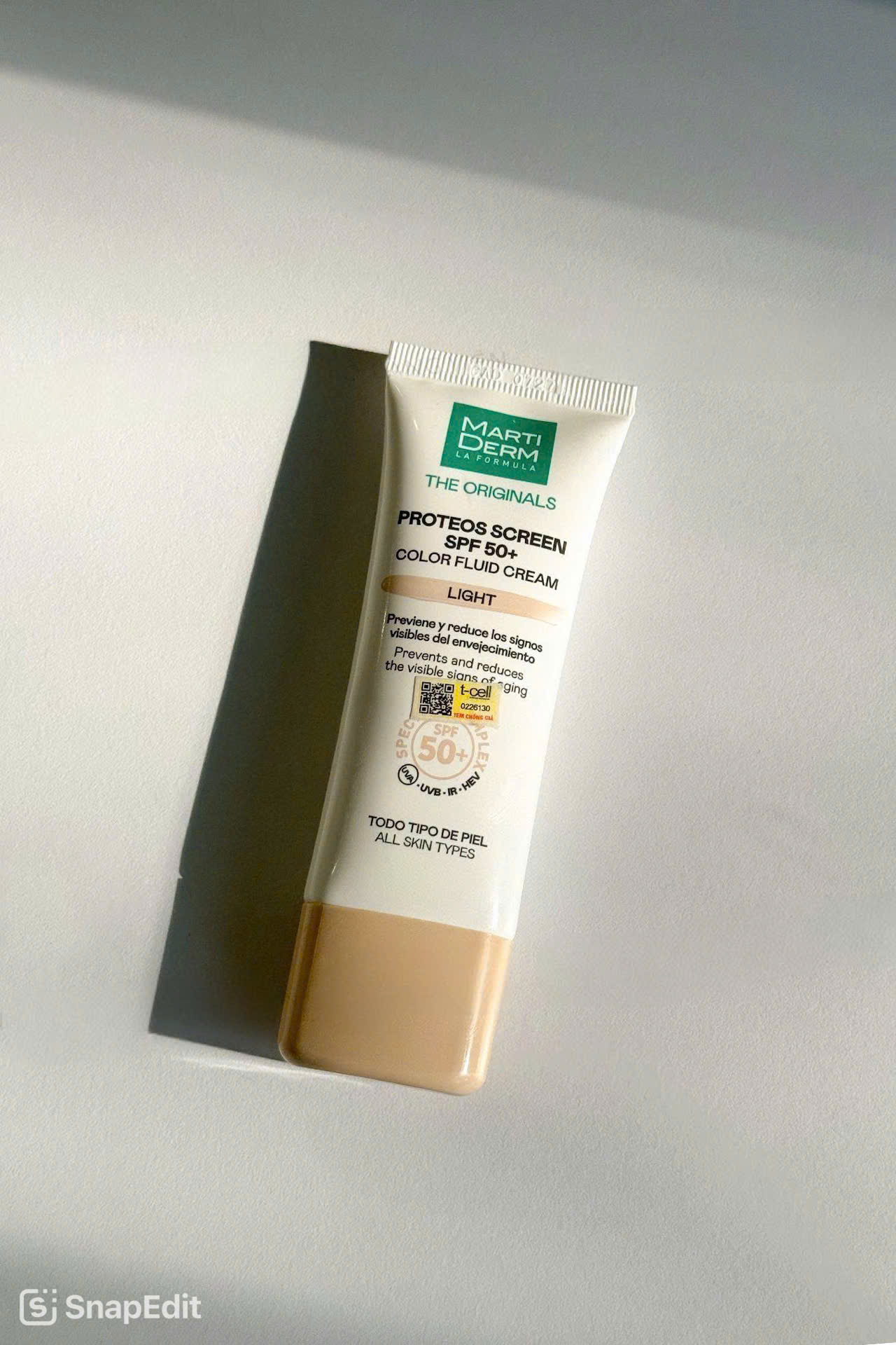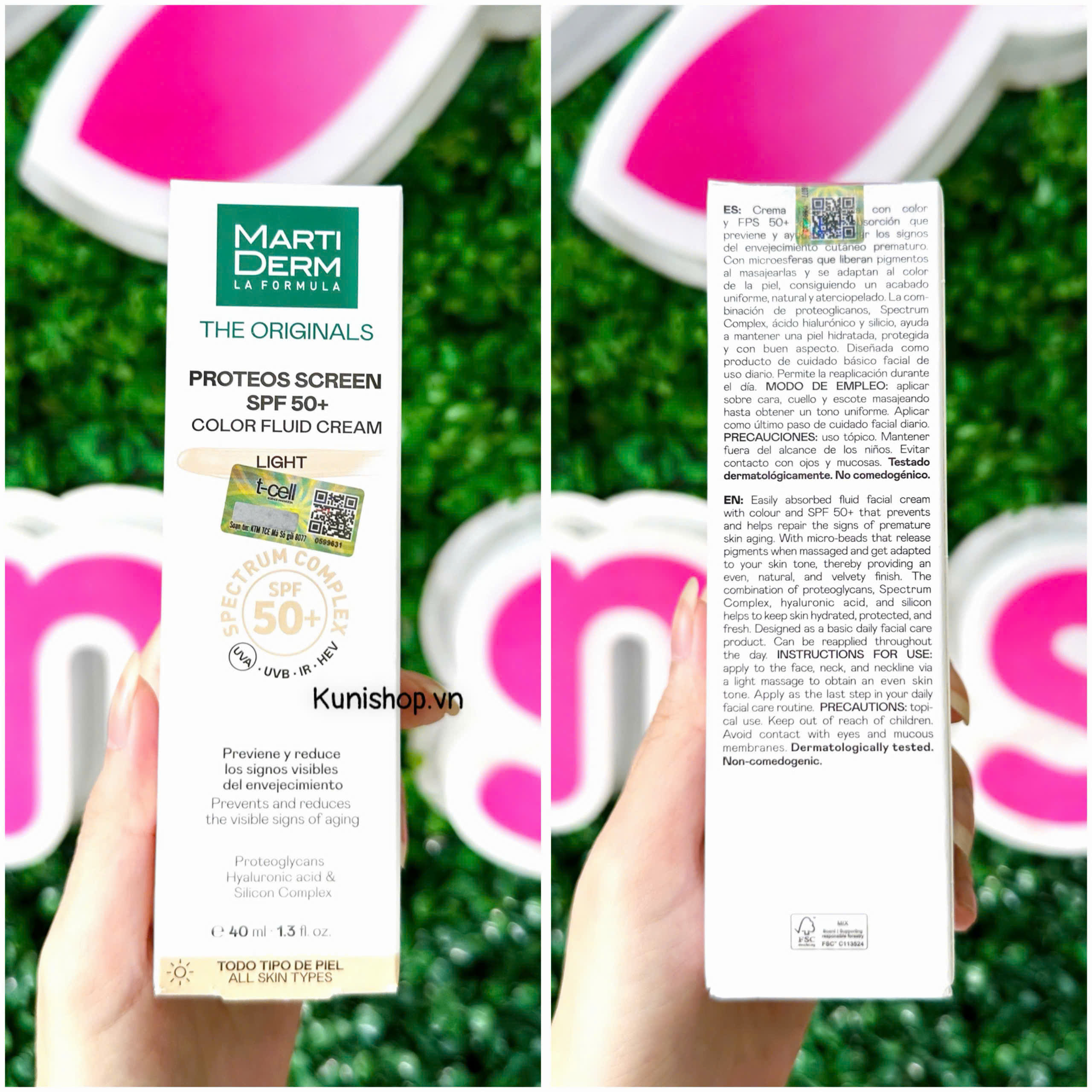 MartiDerm The Originals Proteos Screen SPF 50+ Color Fluid Cream (Light) là phiên bản kem chống nắng chứa các hạt vi màu hiệu chỉnh sắc tố da cũng như che phủ các khuyết điểm giúp làm sáng và đều màu da tức thì. Công thức không chỉ chứa các màng lọc tiên tiến vượt trội để chống lại tia UVA/UVB/IR/HEV (ánh sáng xanh), mà còn chữa lành các tổn thương, cũng như hạn chế tình trạng lão hóa da do hậu quả của tia UV để lại.