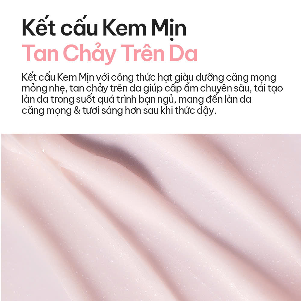 - Kết cấu kem mịn với các hạt giàu dưỡng căng mọng, nhẹ nhàng tan chảy trên da khi sử dụng - tạo thành hàng rào bảo vệ và duy trì độ ẩm, mang đến làn da tươi sáng, rạng rỡ sau khi thức dậy.