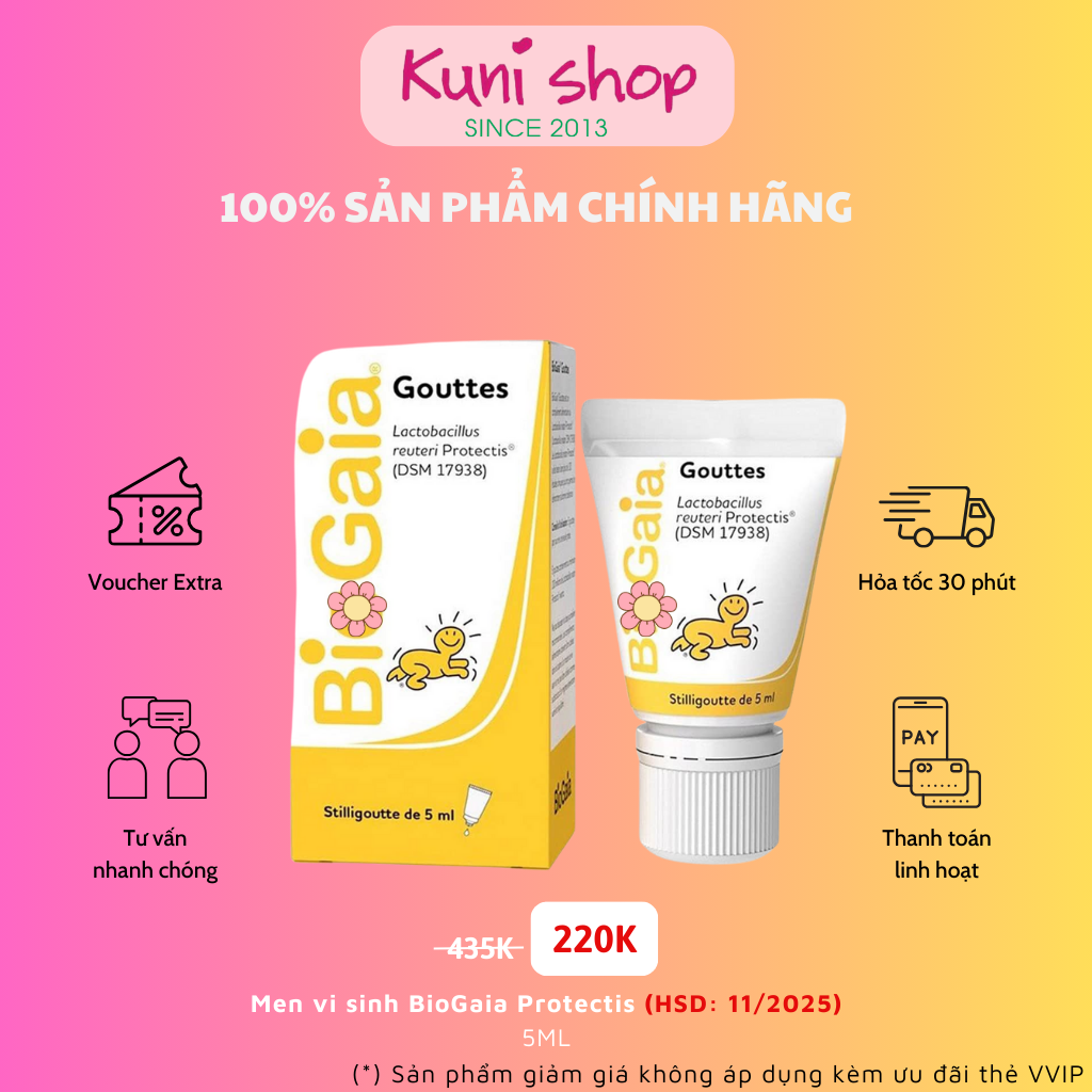 Men vi sinh BioGaia Protectis là sản phẩm chứa chủng lợi khuẩn L.reuteri DSM 17938 với 104 nghiên cứu trên 10.259 người (4.420 trẻ sơ sinh và sinh non) chứng minh hiệu quả ưu việt đối với các rối loạn tiêu hóa chức năng: giảm đau bụng chức năng, cải thiện nhu động ruột, giảm nôn trớ, hỗ trợ điều trị khóc dạ đề (colic) ở trẻ sơ sinh, giảm tỷ lệ táo bón chức năng; viêm dạ dày ruột cấp tính; phòng ngừa nhiễm khuẩn và giảm tác dụng phụ do sử dụng kháng sinh.