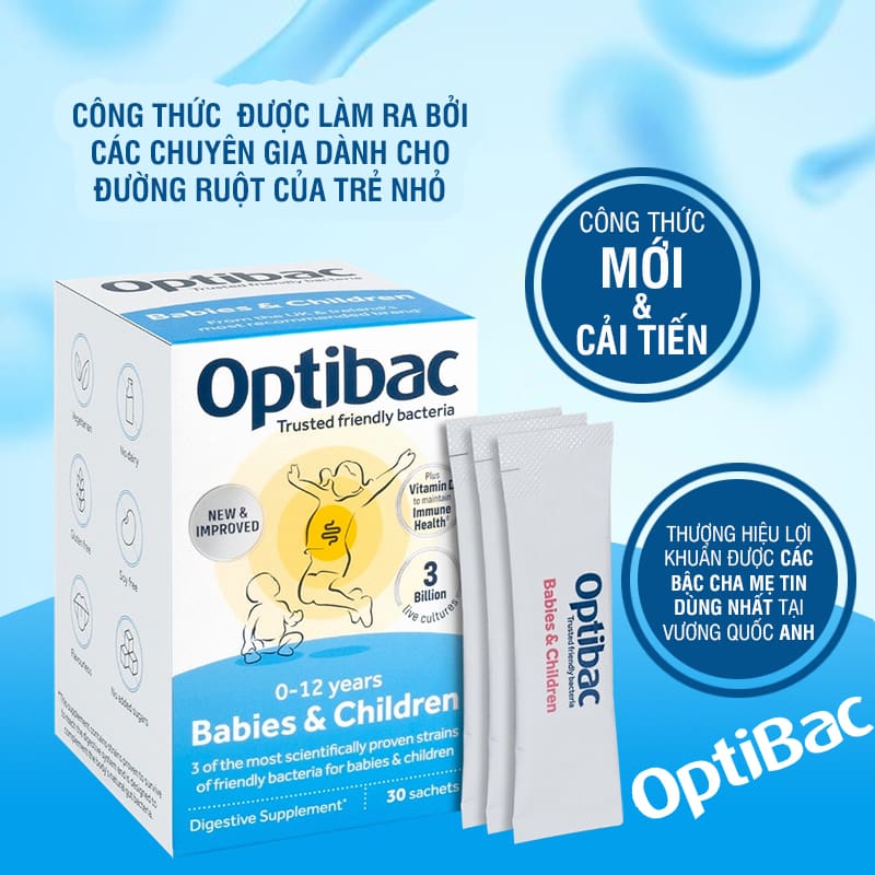 - Men vi sinh cho bé Optibac Babies and Children là thương hiệu men vi sinh bổ sung lợi khuẩn được các bậc phụ huynh tin dùng nhiều nhất tại Vương quốc Anh (theo kết quả cuộc khảo sát độc lập được thực hiện trên 1,000 người ở Anh). Sản phẩm bổ sung vitamin D3, chất xơ và các chủng lợi khuẩn được nghiên cứu nhiều nhất trên thế giới giúp trẻ xây dựng hệ vi sinh vật đường ruột và hệ miễn dịch khỏe mạnh, trong đó: