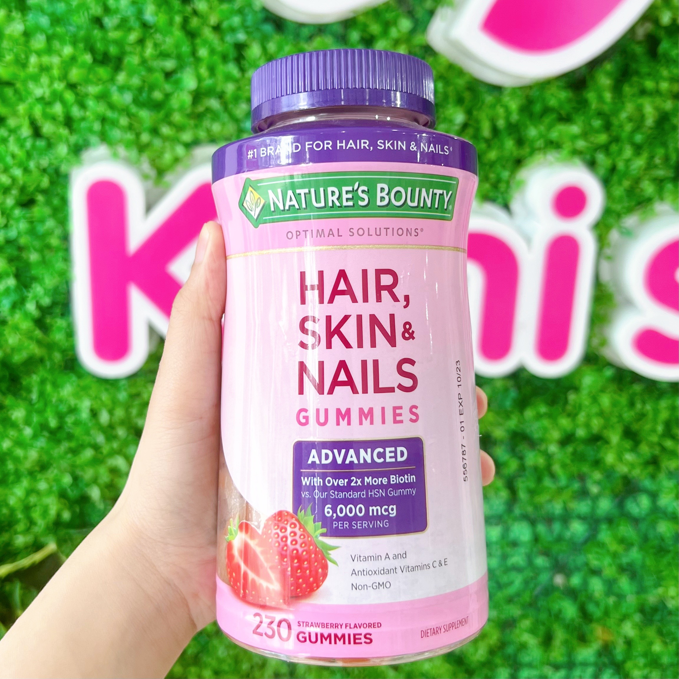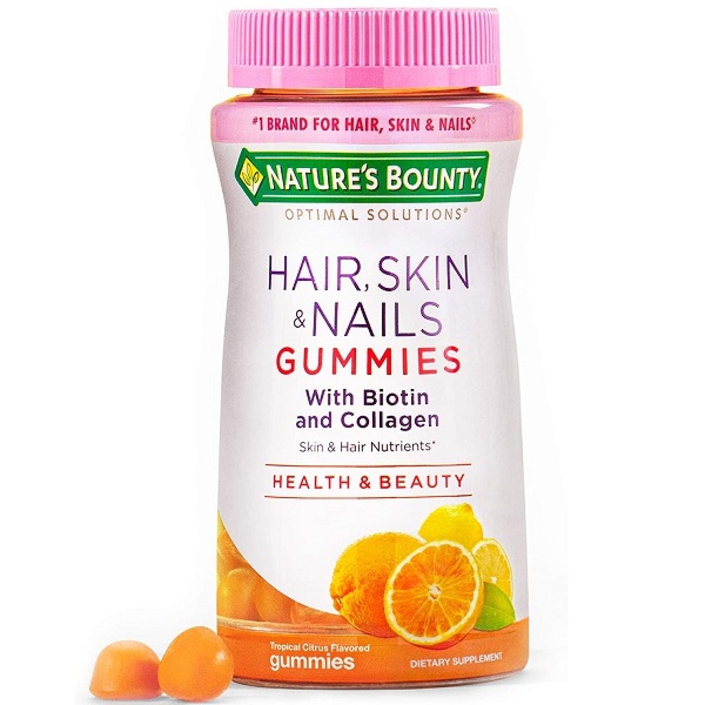 Nature’s Bounty Hair, Skin & Nails with Biotin and Collagen vị cam được sản xuất bởi hãng Nature Bounty (nhà sản xuất các sản phẩm chăm sóc tóc, da và móng nổi tiếng thế giới trong 20 năm qua). Với công thức được kết hợp với số lượng cân bằng các chất dinh dưỡng hỗ trợ giúp tóc bóng mượt, móng tay chắc khỏe và làn da trắng sáng hồng.