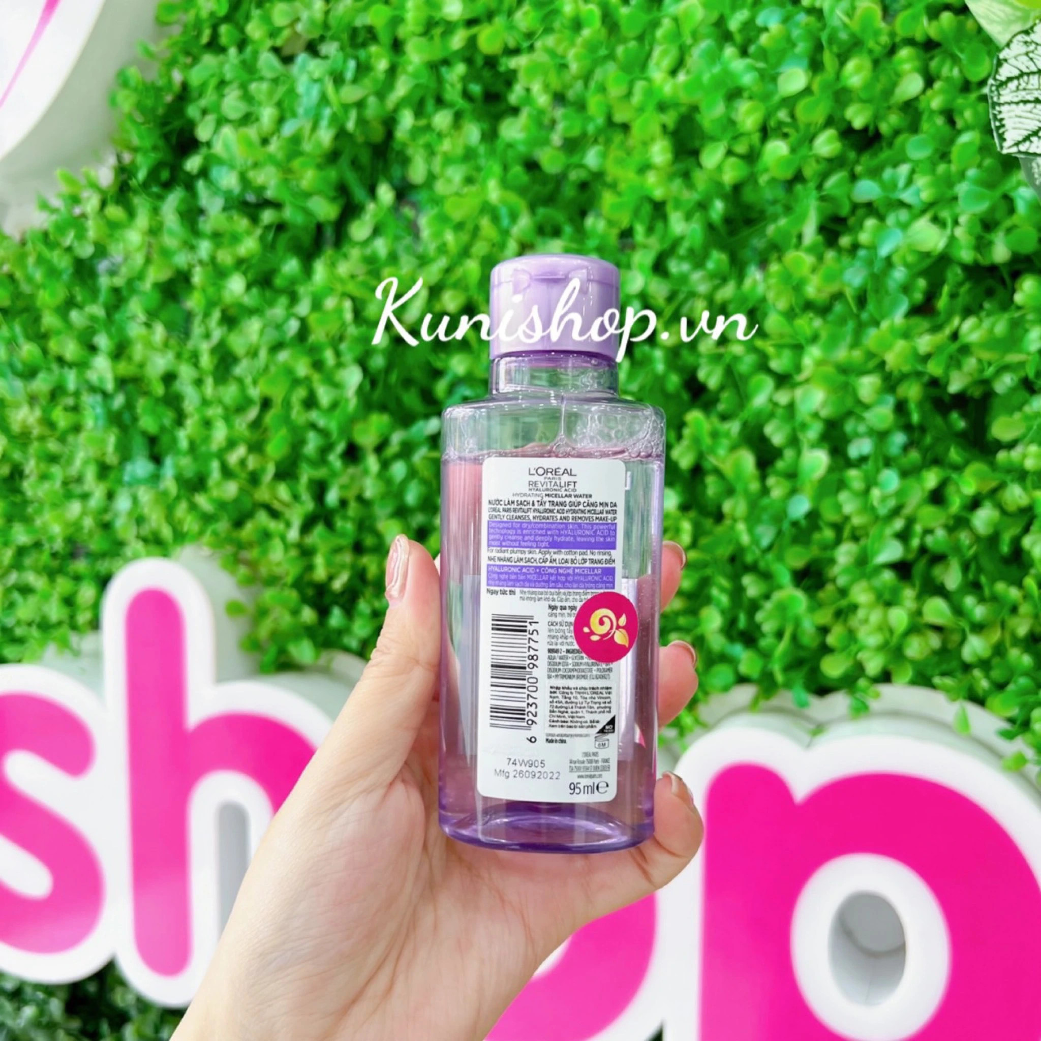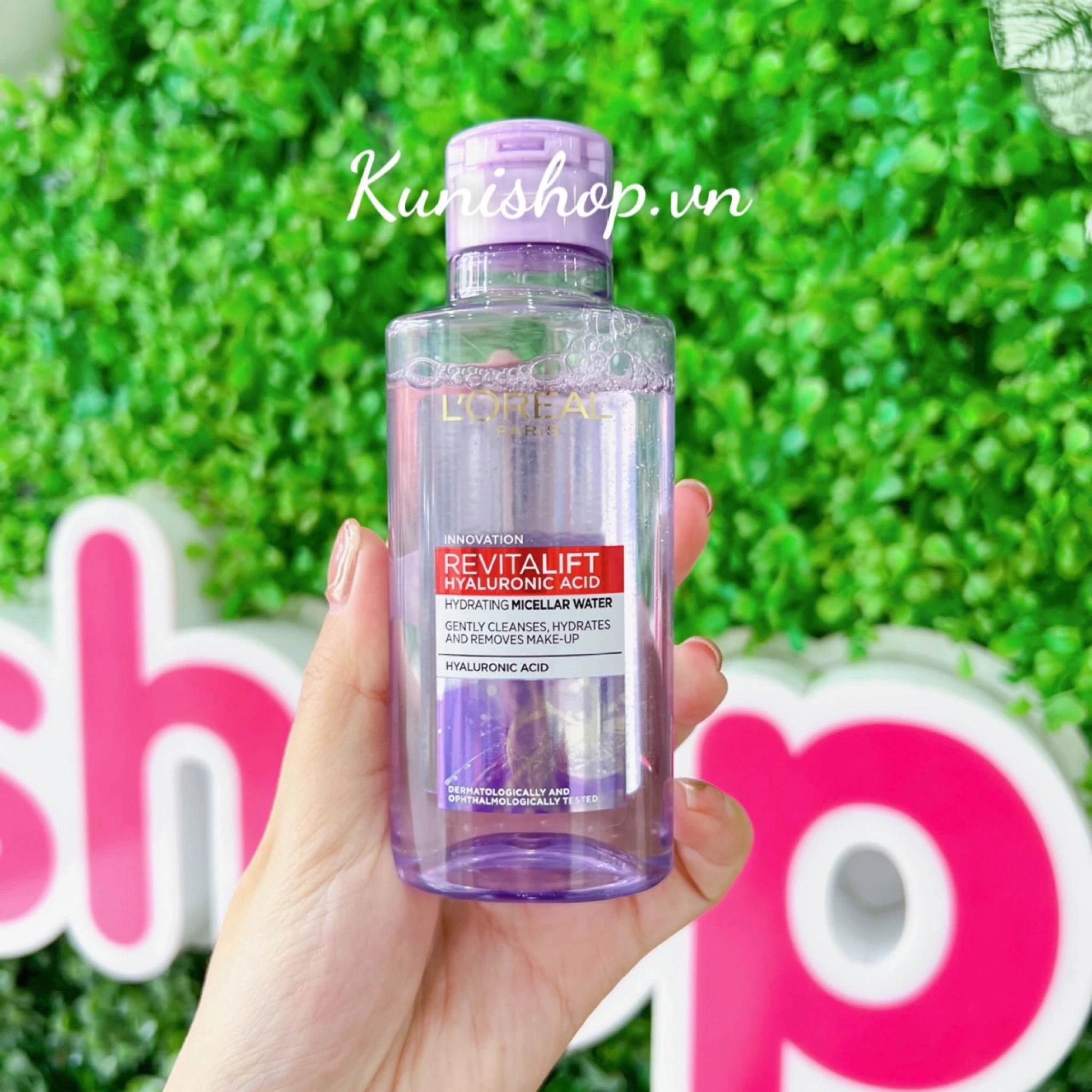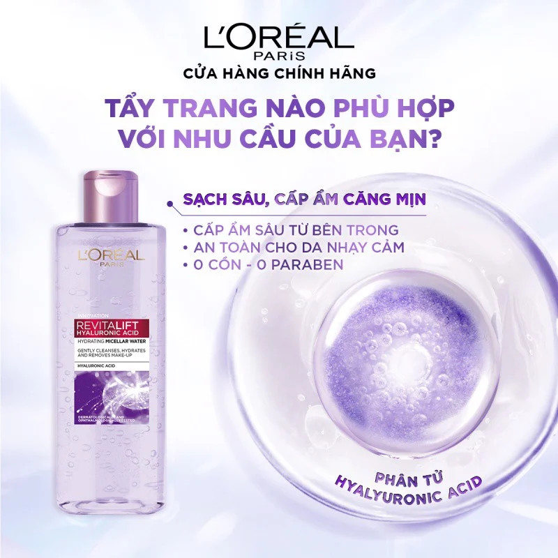- Sức mạnh làm sạch và dưỡng da được chứng minh bởi phòng thí nghiệm Paris Laiya: 93,8% cặn trang điểm, bã nhờn, bụi bẩn được loại bỏ sau khi sử dụng L'oreal Revitalift Hyaluronic Acid Hydrating Micellar Water, 96% kết cấu tươi mát và không nhờn rít.