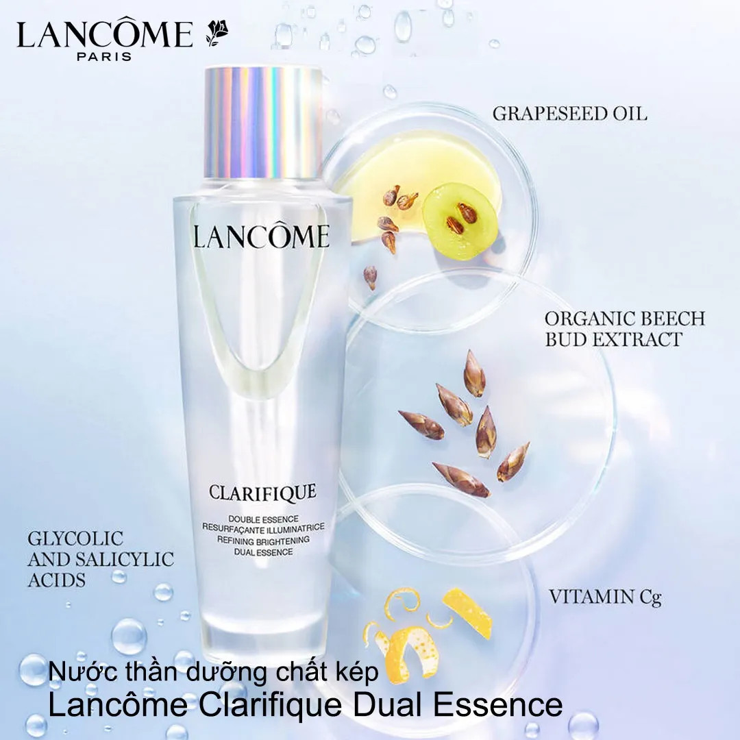 Nước thần Lancome Clarifique Double Essence làm rất tốt nhiệm vụ củng cố lớp màng bảo vệ tự nhiên cho da thêm khỏe và tự duy trì độ ẩm được tốt hơn. Sau 1 tuần sử dụng làn da trắng sáng, min màng hơn. Sau 4 tuần sử dụng làn da được phục hồi tinh tế, các lỗ chân lông được thu nhỏ tối đa, đem lại một làn da trong trẻo, sáng mịn như lụa.