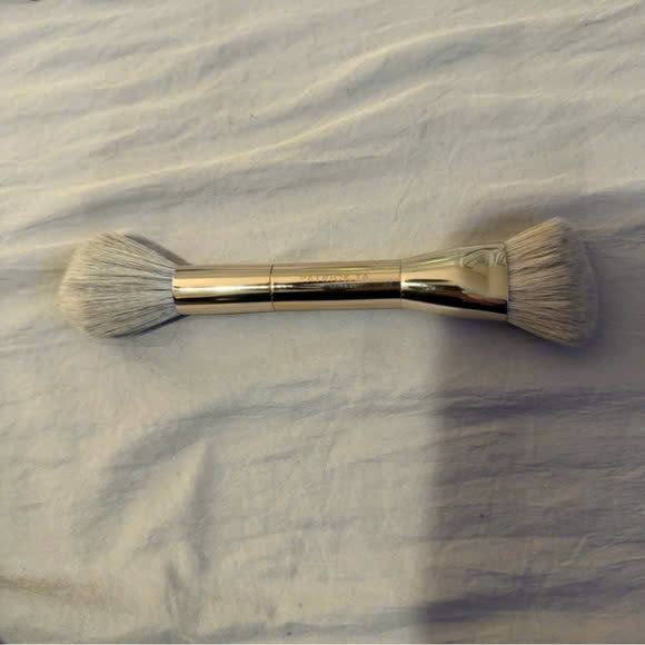 Đây là cọ hai đầu: một đầu “fluffy” (lông mềm và bông) dành cho công thức phấn (powder) để tán màu nhẹ nhàng, và một đầu “dense” (lông dày hơn, chắc hơn) dành cho sản phẩm má hồng dạng kem (cream) để tạo chiều sâu và lên màu rõ hơn