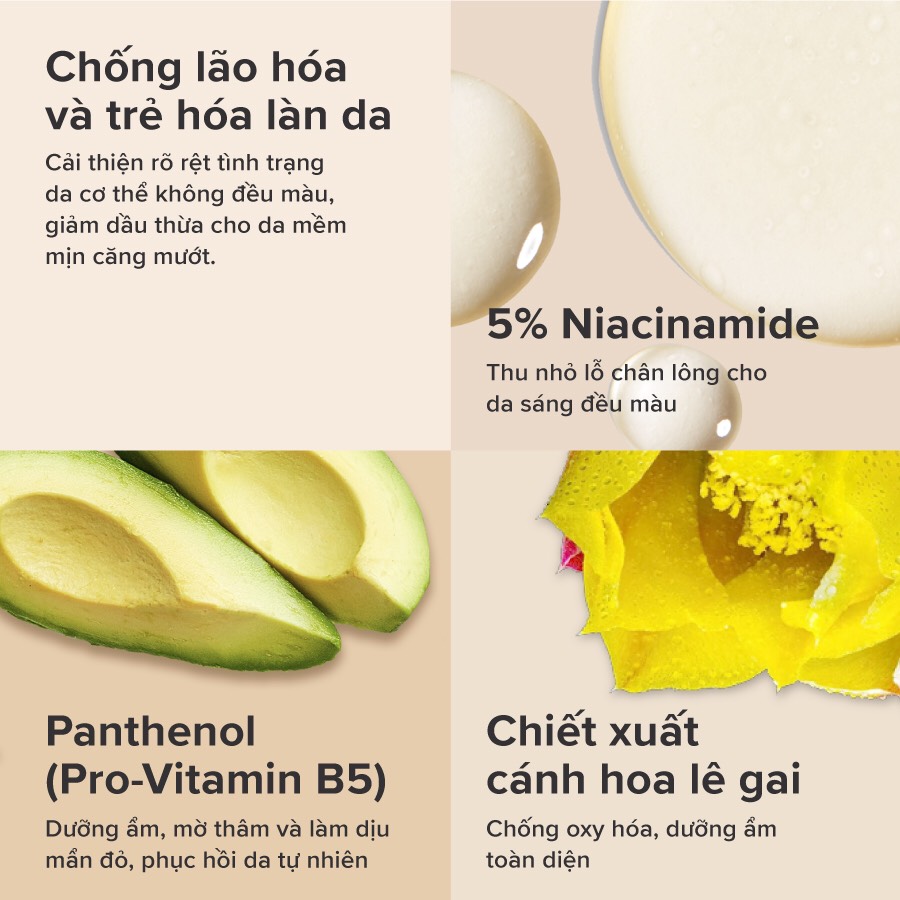 Kết cấu serum đặc biệt dành cho da cơ thể với 5% Niacinamide cùng 5% D-Panthenol (Pro-Vitamin B5) và chiết xuất cánh hoa lê gai thủy phân giúp dưỡng ẩm, đồng thời làm sáng và đều màu da, xóa mờ các vết thâm, phục hồi và tái tạo da, chống oxy hóa toàn diện cho da cơ thể sáng mịn, rạng rỡ.