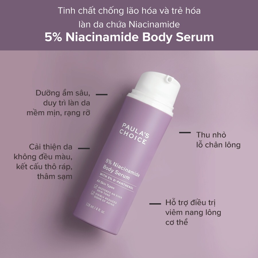 Serum dành cho body thế hệ mới 5% Niacinamide Body Serum có khả năng cải thiện rõ rệt tình trạng da cơ thể không đều màu, đồng thời thu nhỏ lỗ chân lông, giảm dầu thừa, từ đó giúp ngăn ngừa tình trạng viêm nang lông, mụn cơ thể.