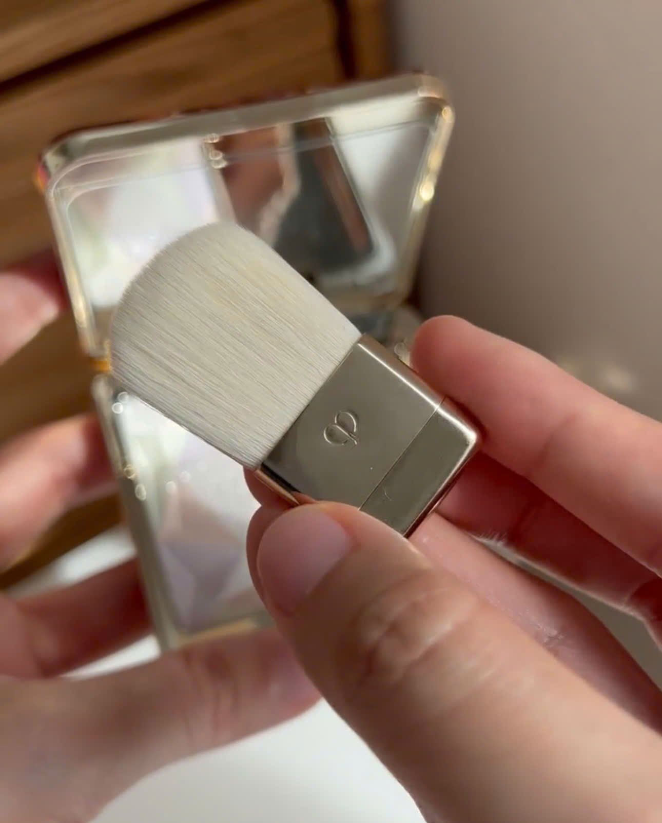 Quét cọ qua lại trên bề mặt phấn nền và di chuyển trên mặt theo hướng từ dưới lên qua xương gò má. Để trông rạng rỡ ấn tượng hơn, hãy sử dụng thêm phấn ở vị trí thái dương.