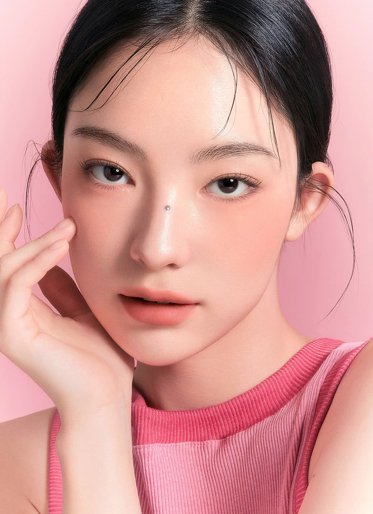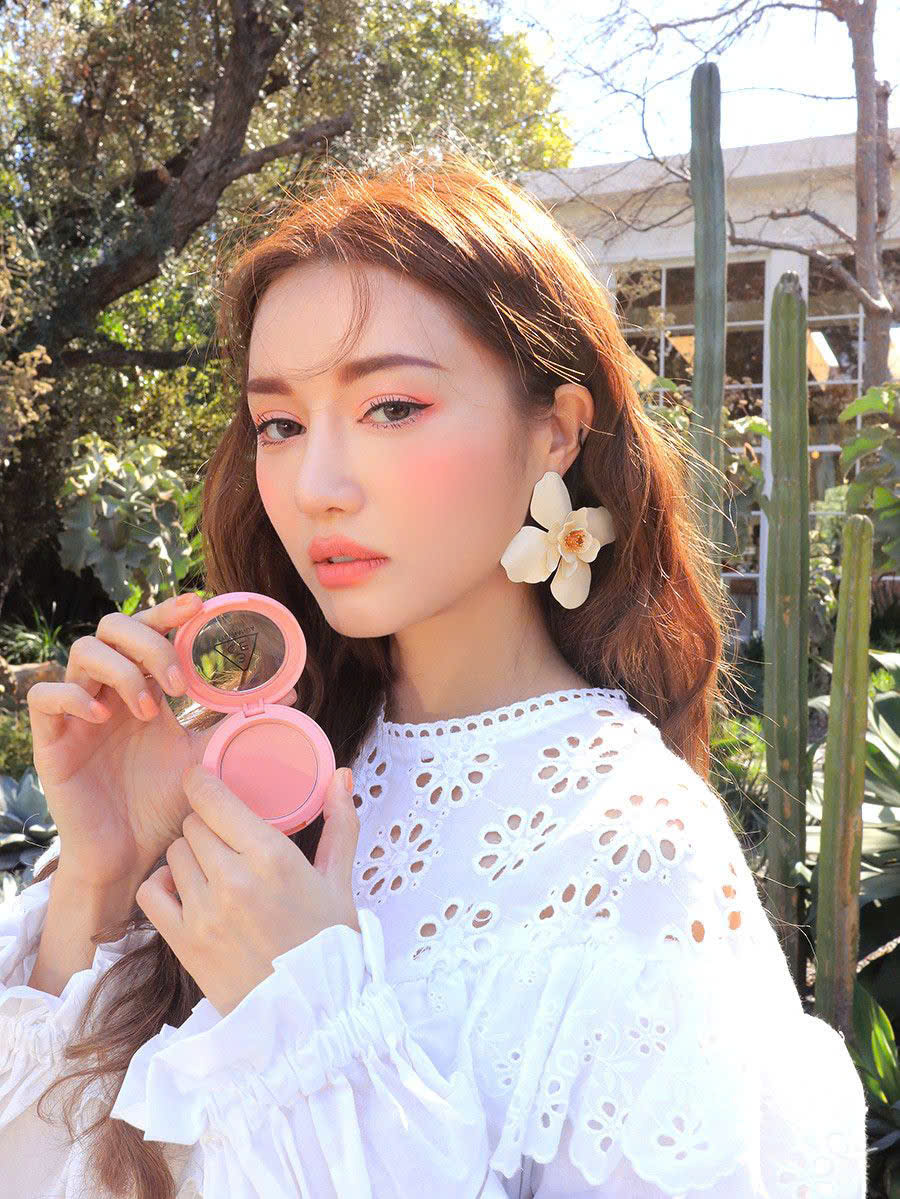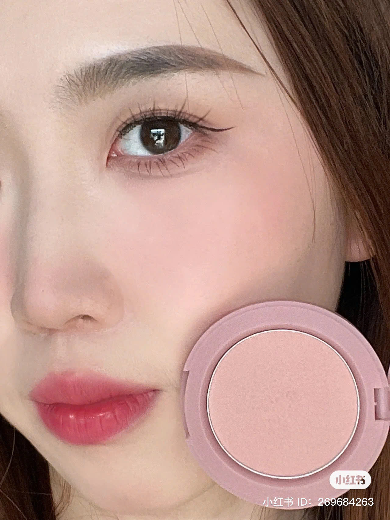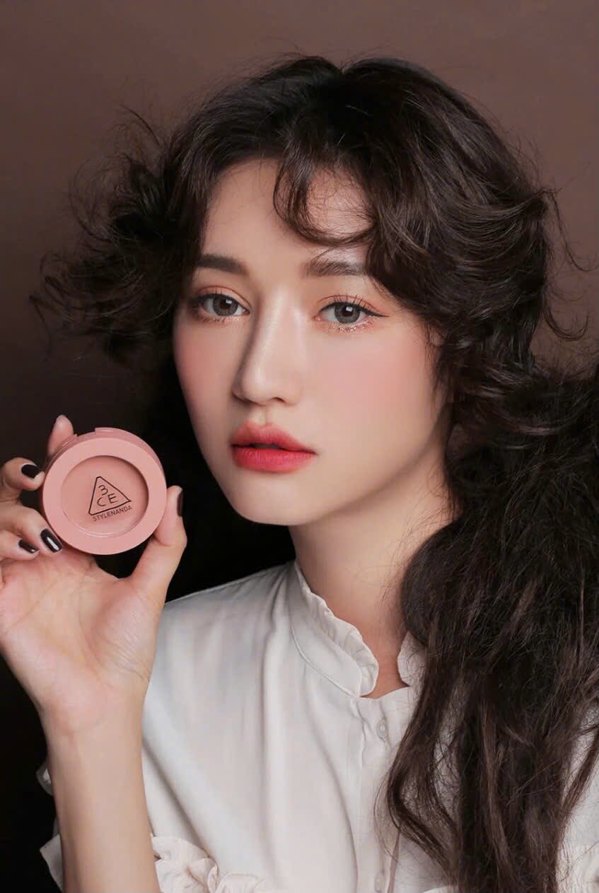 - Sau khi hoàn thành các bước makeup cơ bản, dùng cọ trang điểm chuyên dụng cho má, lấy một lượng phấn vừa phải và thoa nhẹ nhàng lên má.