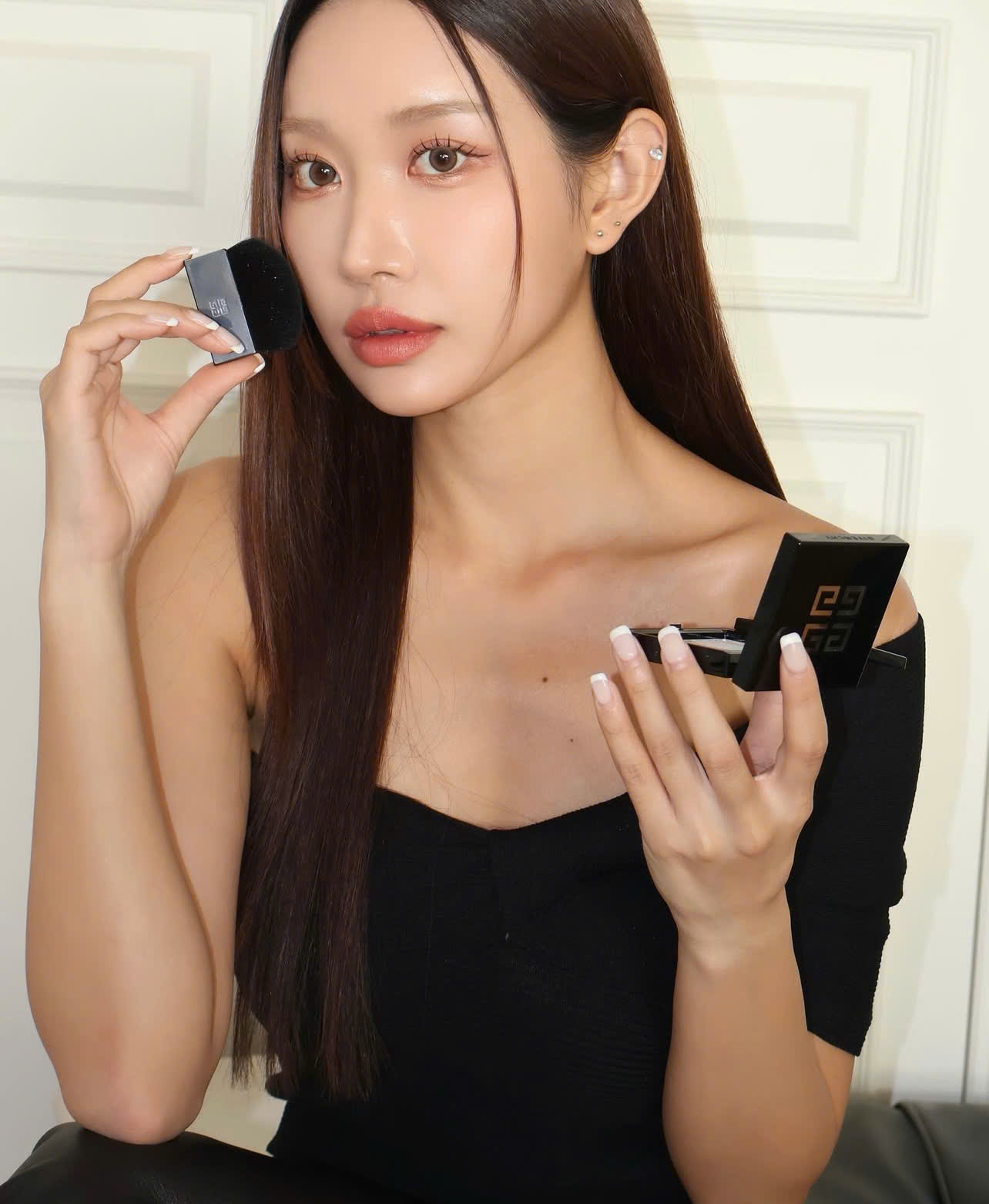 Sử dụng bông phấn hoặc cọ để lấy phấn và phủ đều lên trên da mặt.