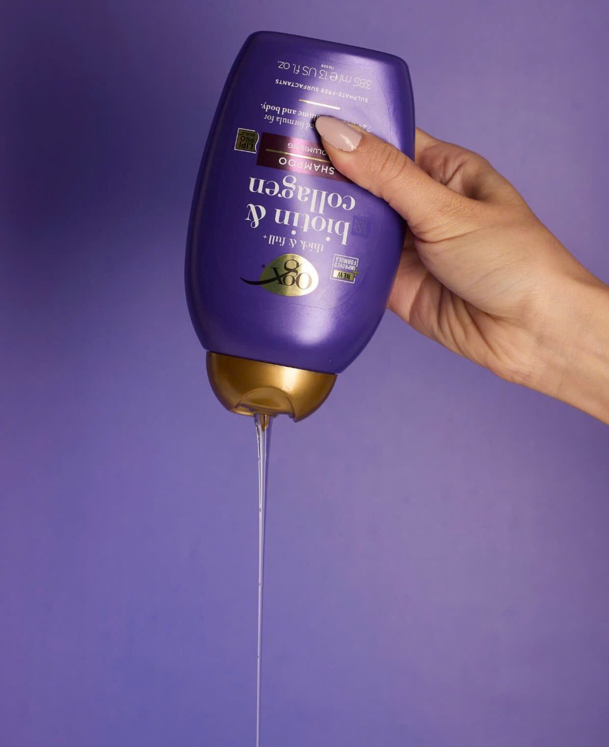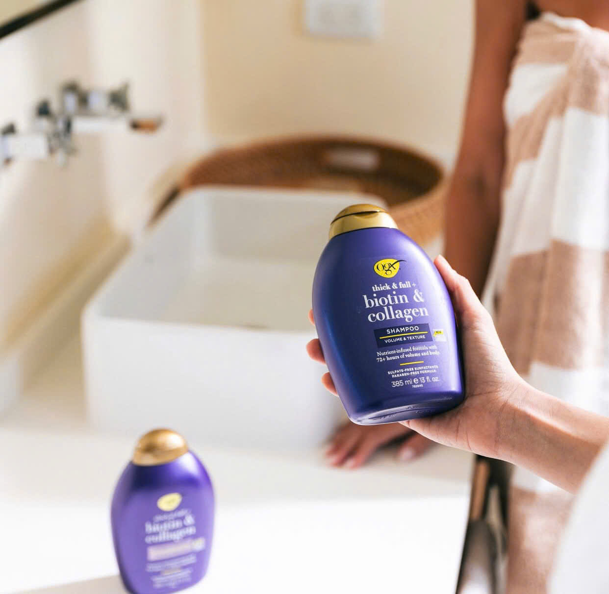 - Bô dầu gội – dầu xả Organix Thick & Full Biotin & Collagen có hợp chất ProVitamin B7 và biotin, tạo ra các chất dinh dưỡng thấm sâu, phục hồi từ bên trong sợi tóc.