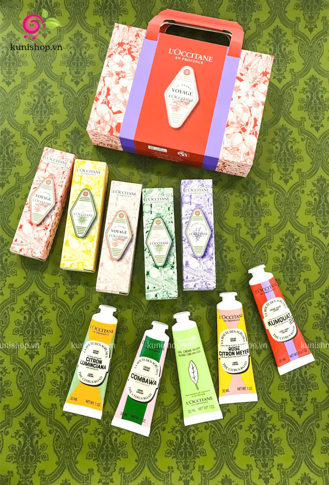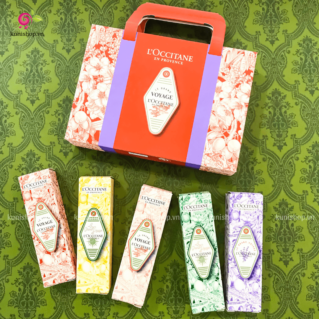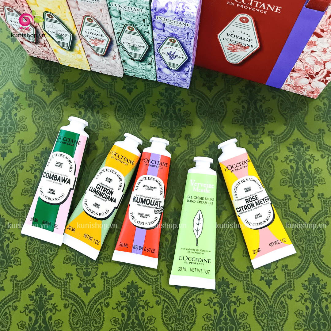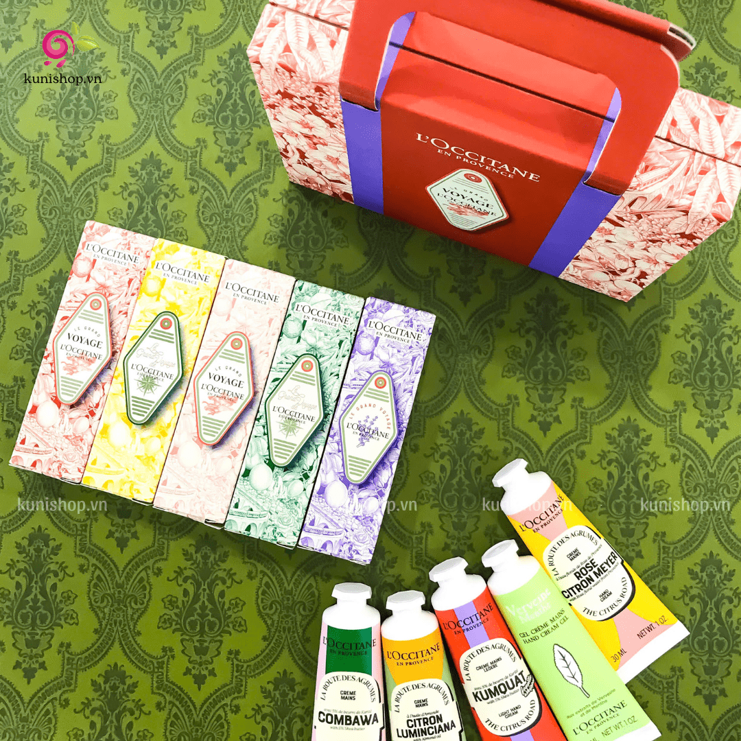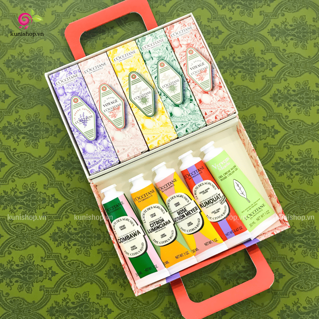 Set Kem Dưỡng Da Tay L’Occitane Le Grand Voyage Hand Cream bao gồm 5 loại kem dưỡng với những mùi hương tuyệt vời, mỗi loại mang lại một trải nghiệm chăm sóc da tay hoàn toàn khác biệt: