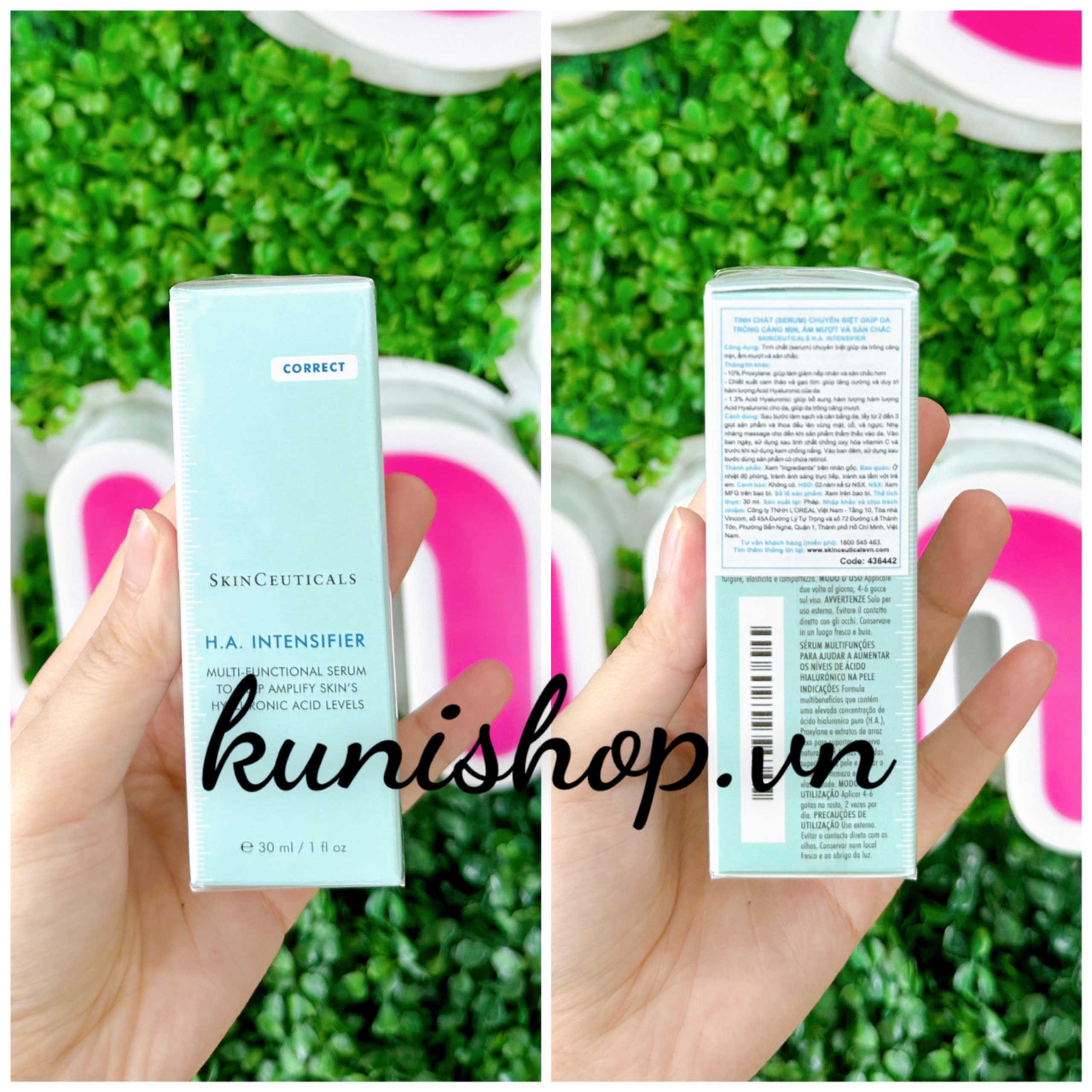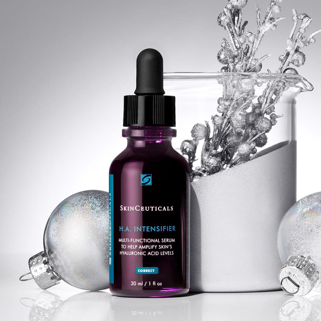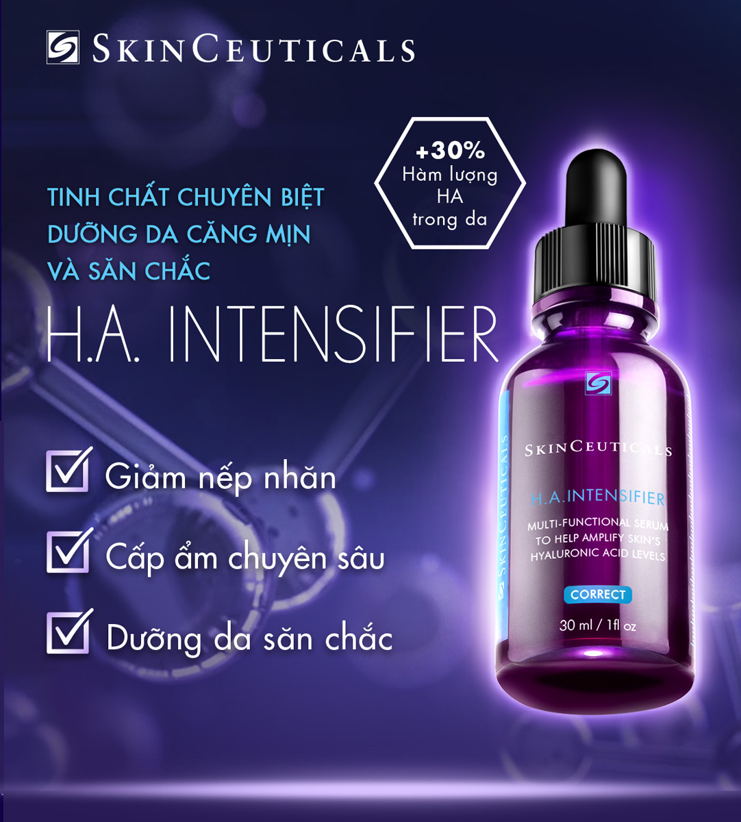 H.A Intensifier là loại huyết thanh hiệu chỉnh được nhiều tác động được chứng minh có khả năng tăng nồng độ Hyaluronic Acid cho da. SkinCeuticals Hyaluronic Acid Intensifier chứa hàm lượng cao axit hyaluronic nguyên chất, proxylane và các chất có chiết xuất từ rễ cam thảo và gạo tía để hỗ trợ lượng axit hyaluronic trong da và cung cấp hydrat hóa bề mặt da. Giúp cải thiện rõ rệt sự săn chắc, mịn màng và căng bóng của làn da. Huyết thanh Hyaluronic Acid có thể được sử dụng như là một phần của một chế độ chăm sóc da tại nhà sau khi trải qua quá trình trị liệu bằng fillers.
