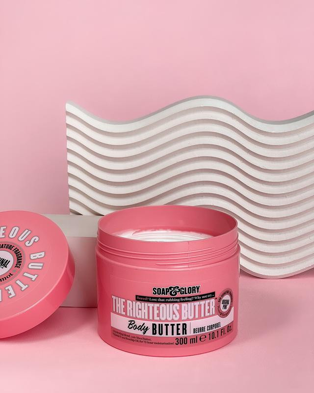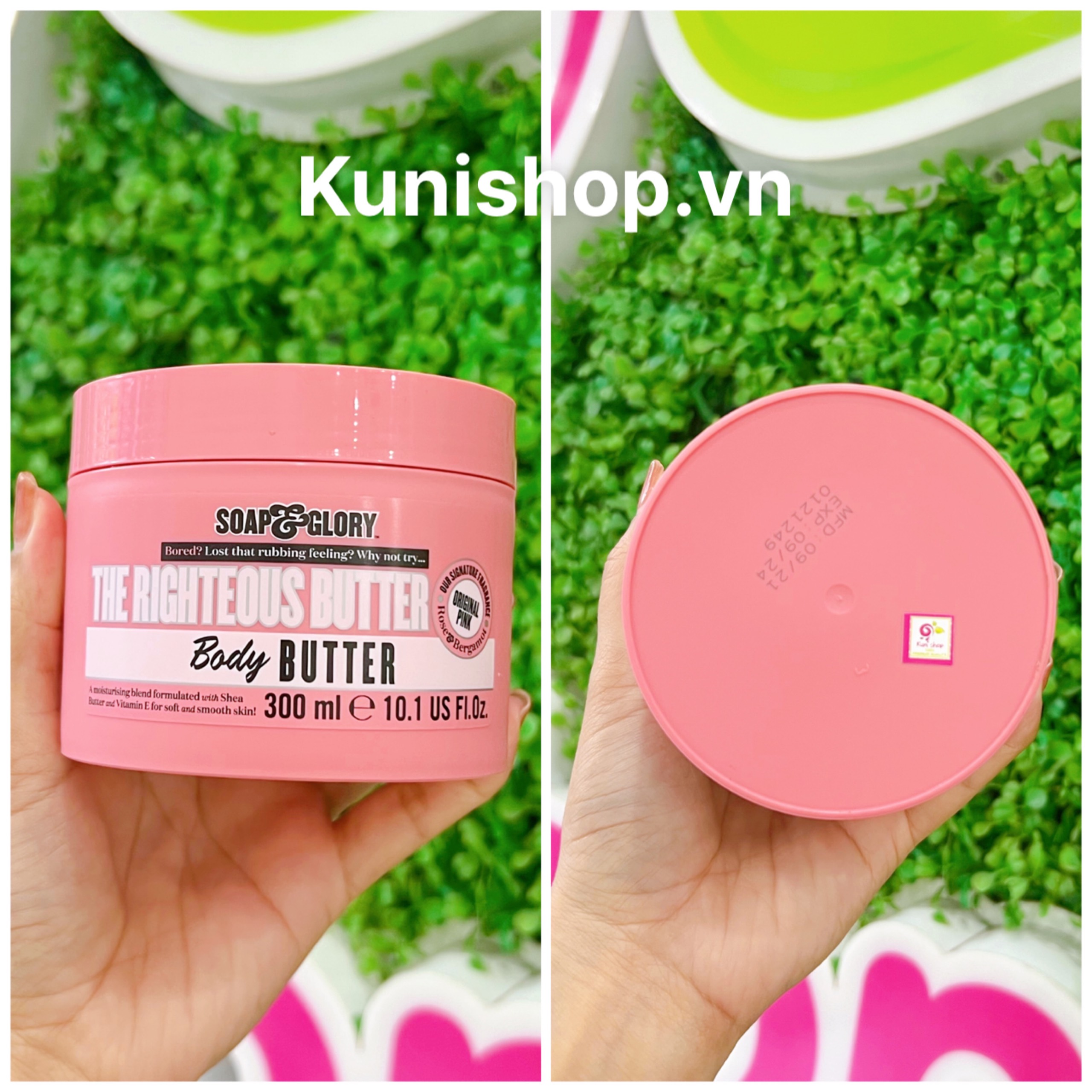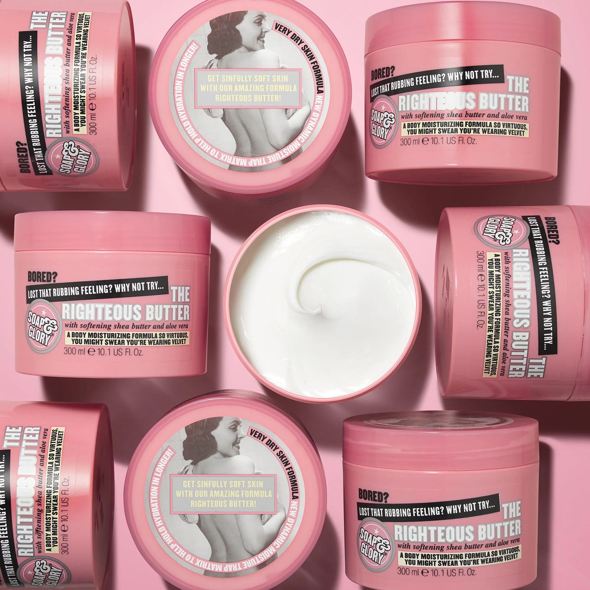 Nhắc tới Soap and Glory, không thể không nhắc tới bơ dưỡng thể The Righteous Butter, sản phẩm giúp gây được tiếng vang cho thương hiệu táo bạo này khi được bình chọn là “Bơ dưỡng thể tốt nhất nước Anh”. Với 2 thành phần chính Shea Butter (Bơ Hạt Mỡ) và Aloe Vera (Lô hội), bơ dưỡng thể cung cấp độ ẩm cao, làm dịu và hồi phục lại làn da khô ráp, cung cấp độ ẩm để da luôn mềm, mịn suốt ngày dài.
