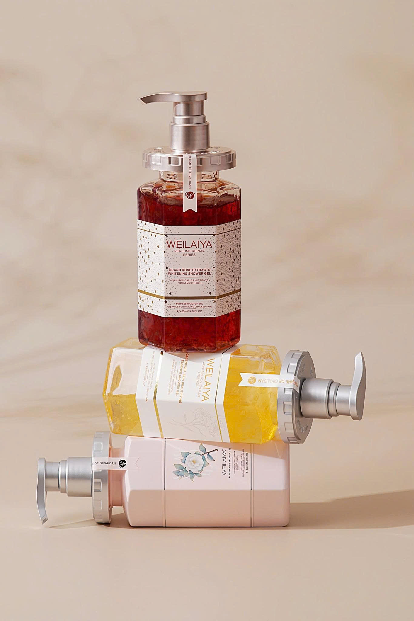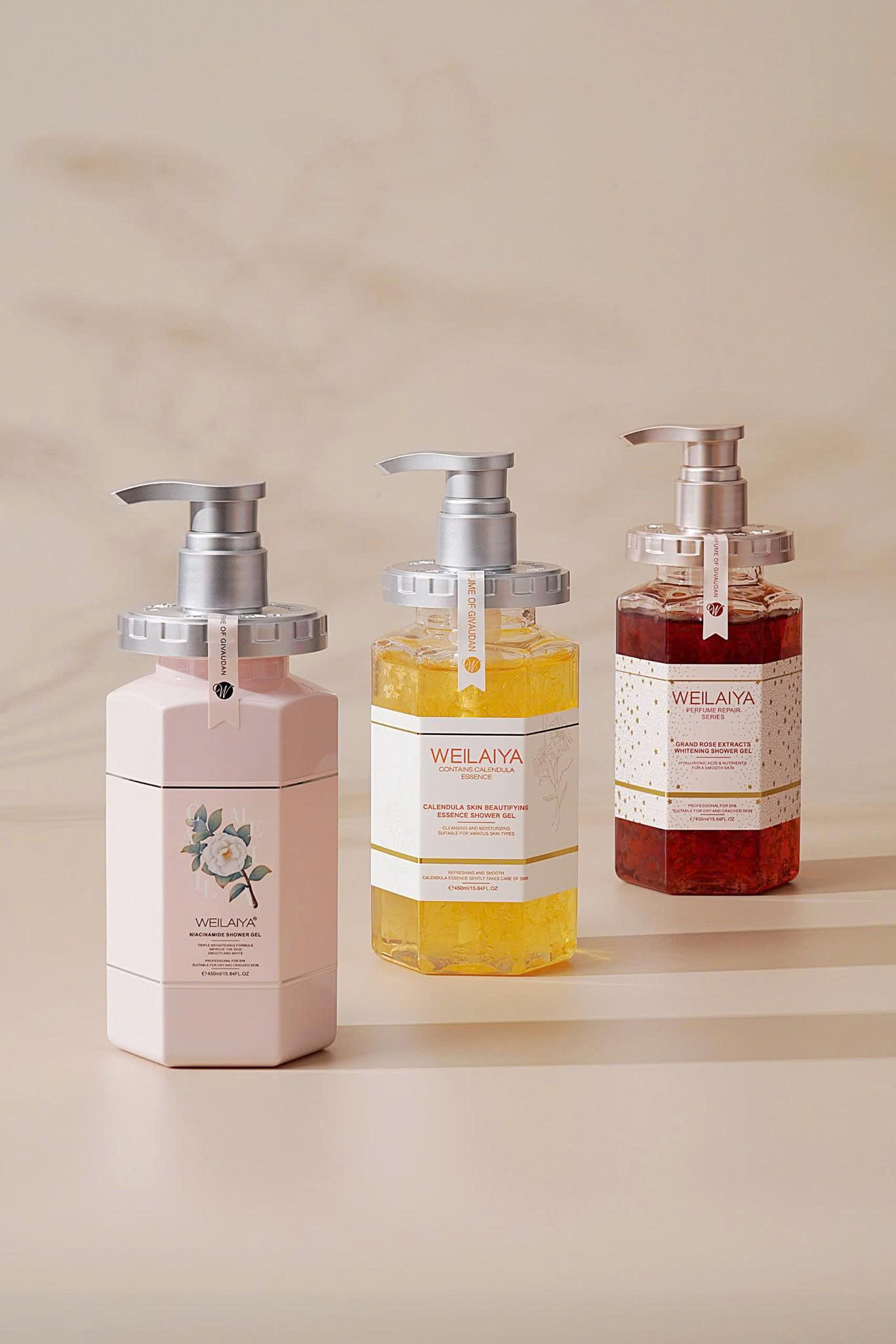 Sản phẩm sữa tắm mới toanh đến từ Weilaiya có một thiết kế cực kì mới lạ và độc đáo so với các dòng sản phẩm khác trên thị trường. Em sữa tắm này có thân chai dạng hình lục giác với chất liệu nhựa trong suốt và dễ dàng nhìn thấy kết cấu sản phẩm bên trong. Nắp của chai sữa tắm này là dạng vòi pump với tone màu hồng gold cực kì sang trọng. Mặc dù phần nắp cũng làm từ nhựa nhưng chất liệu cực kì dày dặn và dễ sử dụng.