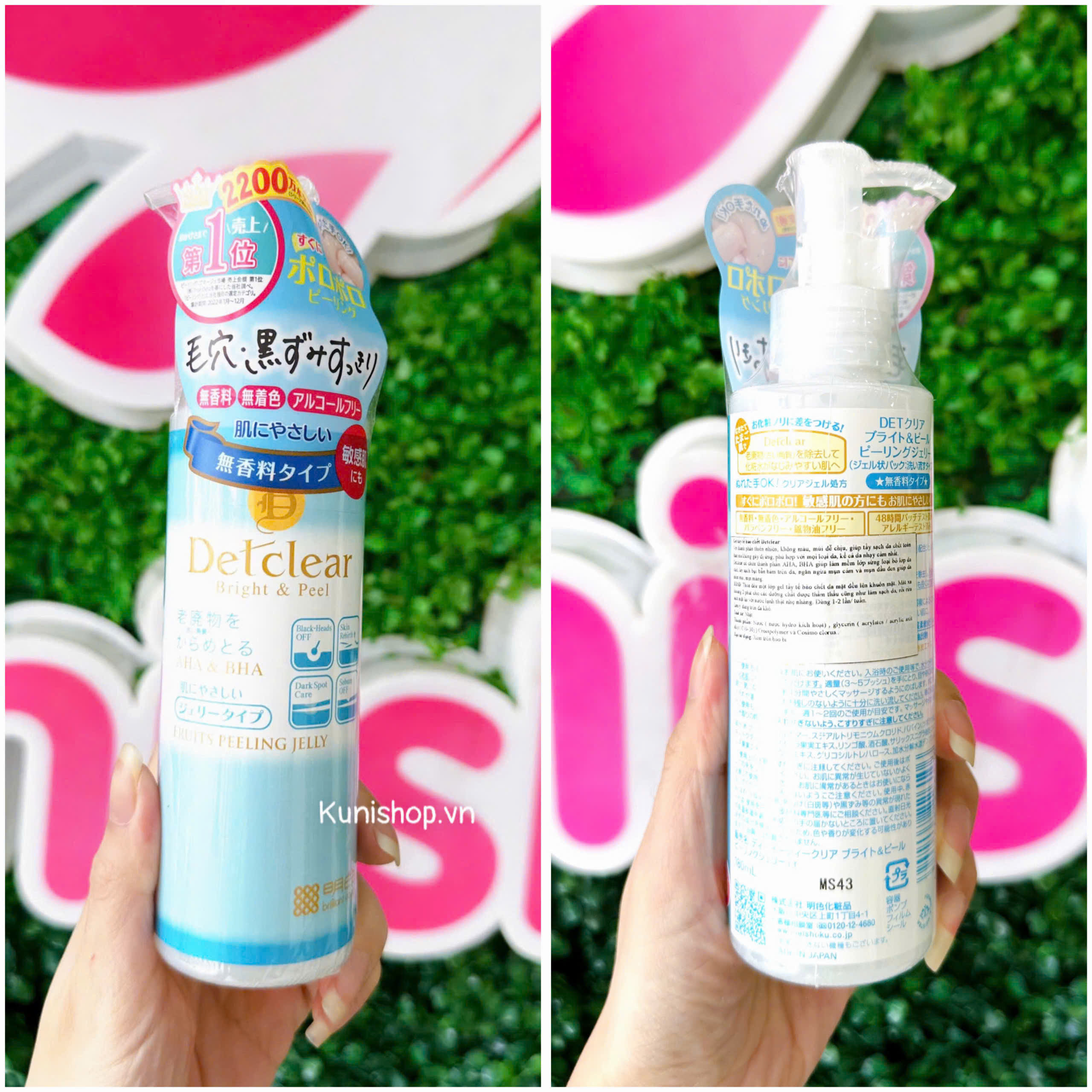 Meishoku Detclear Peeling Gel hoàn toàn tinh khiết, không màu, không mùi, không paraben hay mineral oil dạng gel dịu nhẹ phù hợp với làn da nhạy cảm nhất. Có người còn đánh giá nó như bản dupe hoàn hảo của Cure Natural Aqua Gel. Thành phần chính của sản phẩm tẩy da chết này là AHA và BHA. Chúng giúp làm sạch da cả trên bề mặt và tận sâu trong lỗ chân lông. Bản chất của AHA là các acid tan trong nước hoạt động và tái tạo chủ yếu trên bề mặt da. Trong khi đó BHA là acid tan trong dầu có khả năng thấm sâu và họat động bên trong lỗ chân lông.