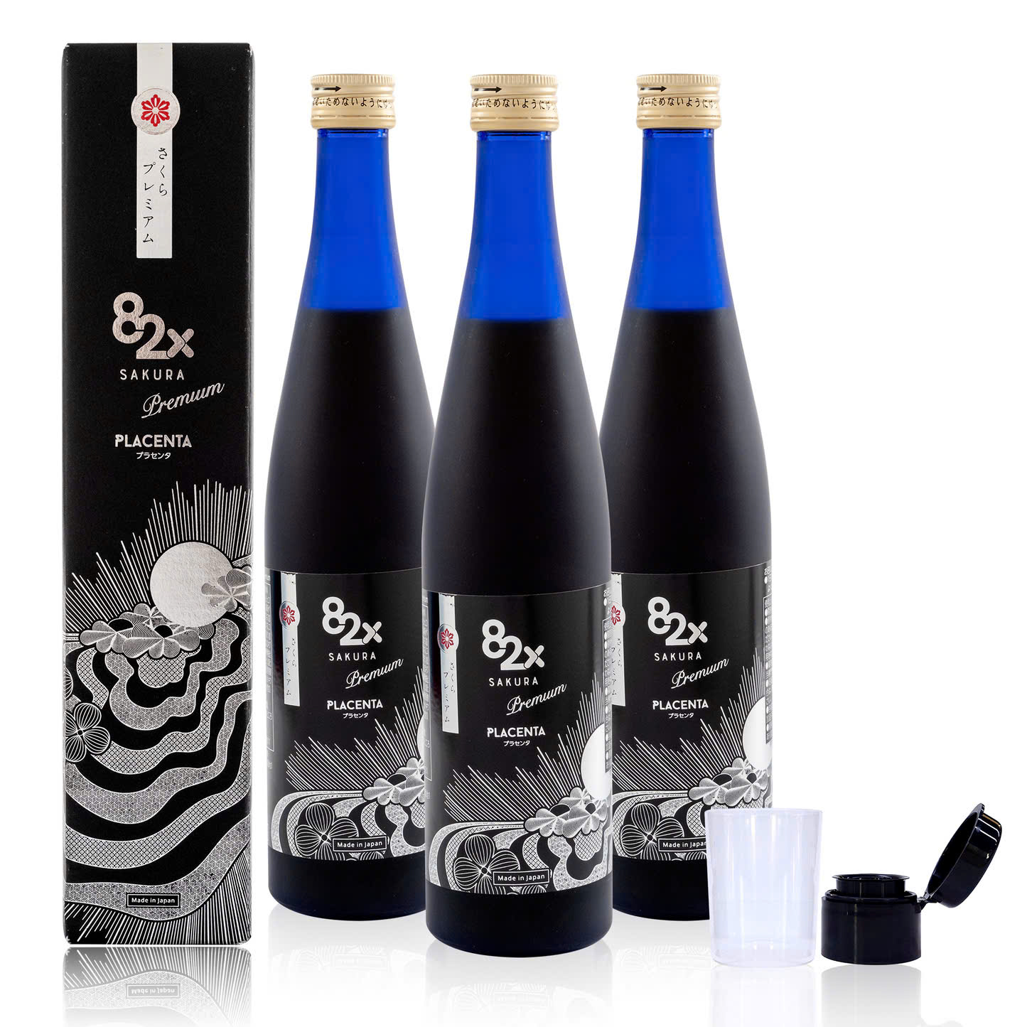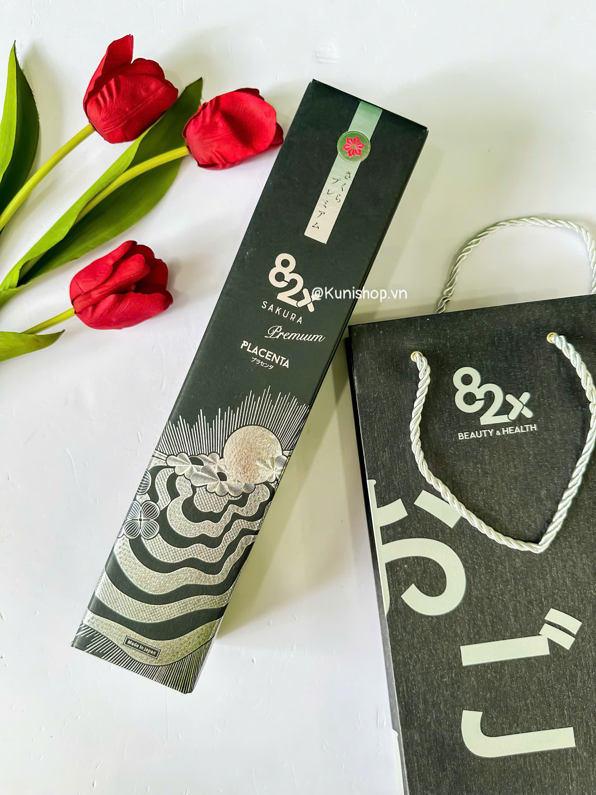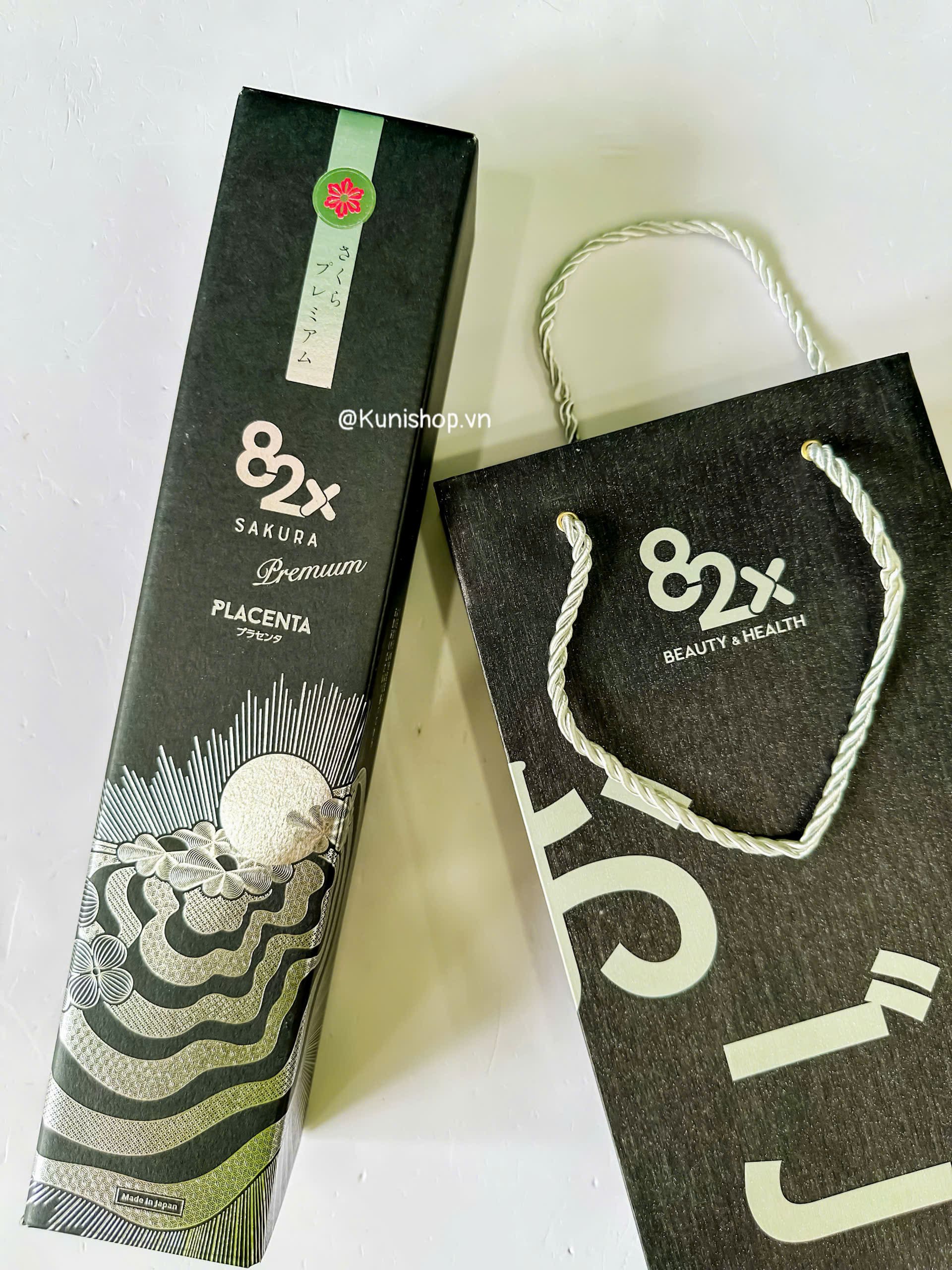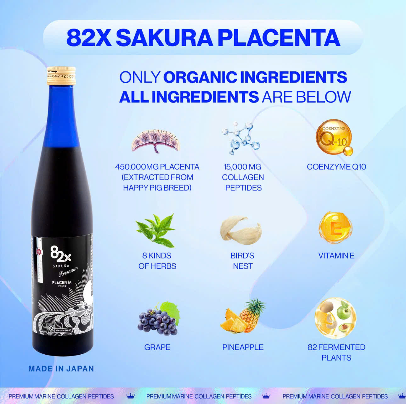 Tinh chất nhau thai placenta 82X Sakura Premium có thành phần chính bao gồm chiết xuất nhau thai heo (hàm lượng cao), Collagen Peptide từ cá, chiết xuất 82 loại thực vật lên men (chứa nhiều vitamin, khoáng chất, amino acid), chiết xuất hoa anh đào, chiết xuất xoài Châu Phi, bột nước dừa, tổ yến, Coenzyme Q10, Hyaluronic Acid, Elastin thủy phân, và các loại vitamin B1, B2, B6, Vitamin E, D. Sản phẩm còn chứa chiết xuất từ nho nụ (chứa resveratrol) và các thành phần thảo mộc khác giúp hỗ trợ làm đẹp và tăng cường sức khỏe.
