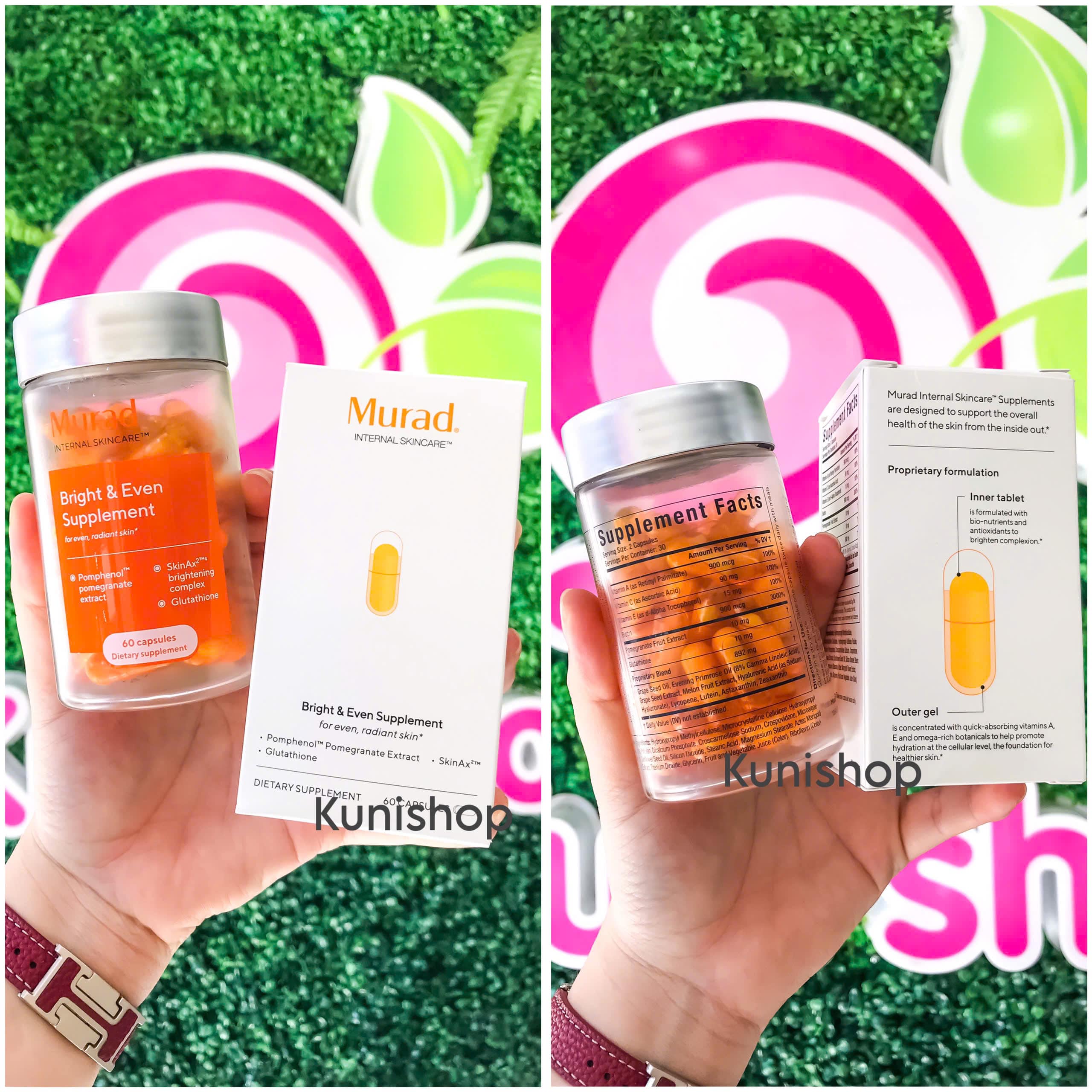 Viên uống chống nắng, trắng da Murad Bright & Even Supplement chiết xuất từ 100% hạt lựu, có khả năng bảo vệ da khỏi tác động của môi trường bên ngoài, đặc biệt là các tia cực tím trong ánh nắng mặt trời. Đồng thời, Viên uống chống nắng Murad cũng giúp tăng cường khả năng sản sinh collagen, giúp hạn chế hình thành nếp nhăn, giữ được làn da săn chắc, căng mịn.