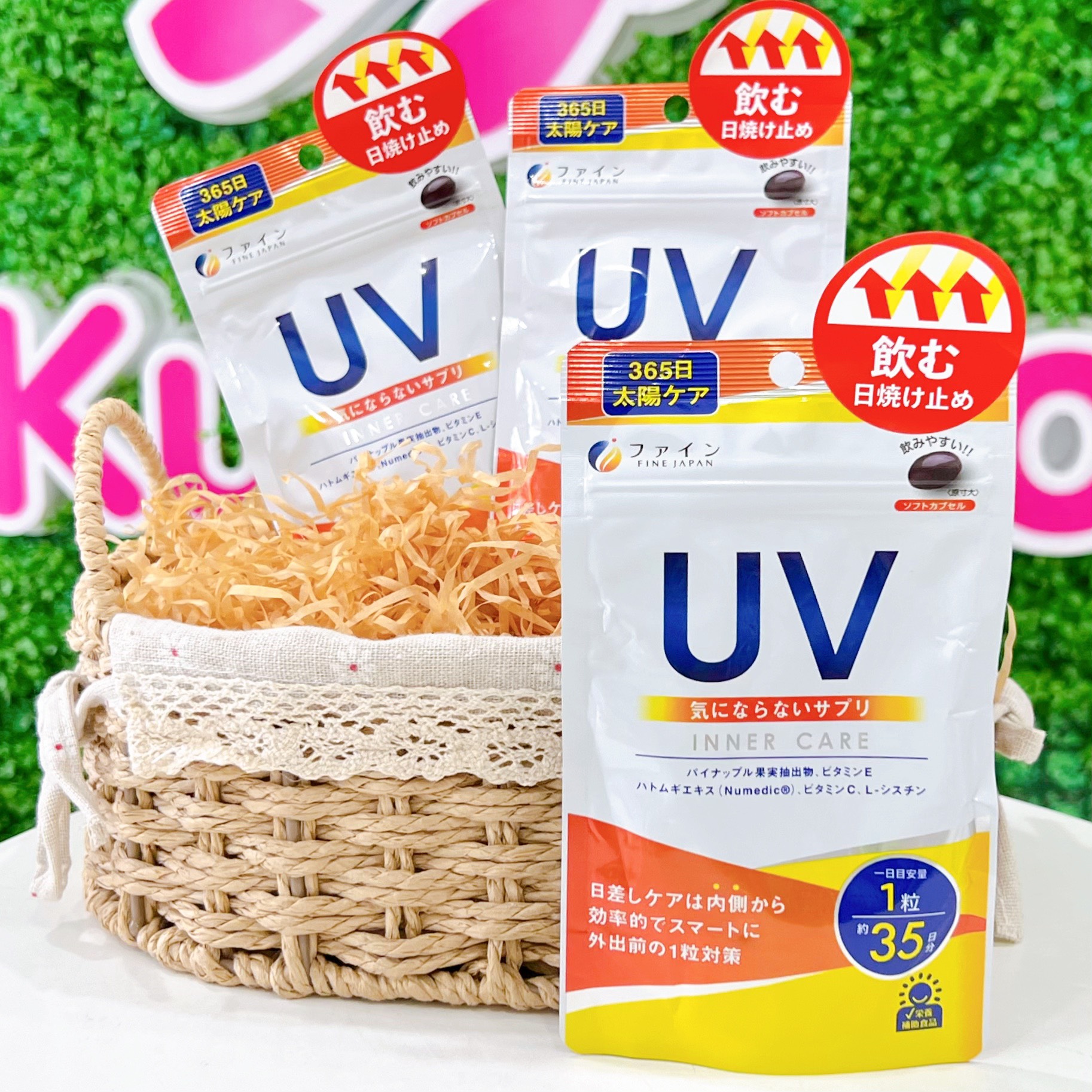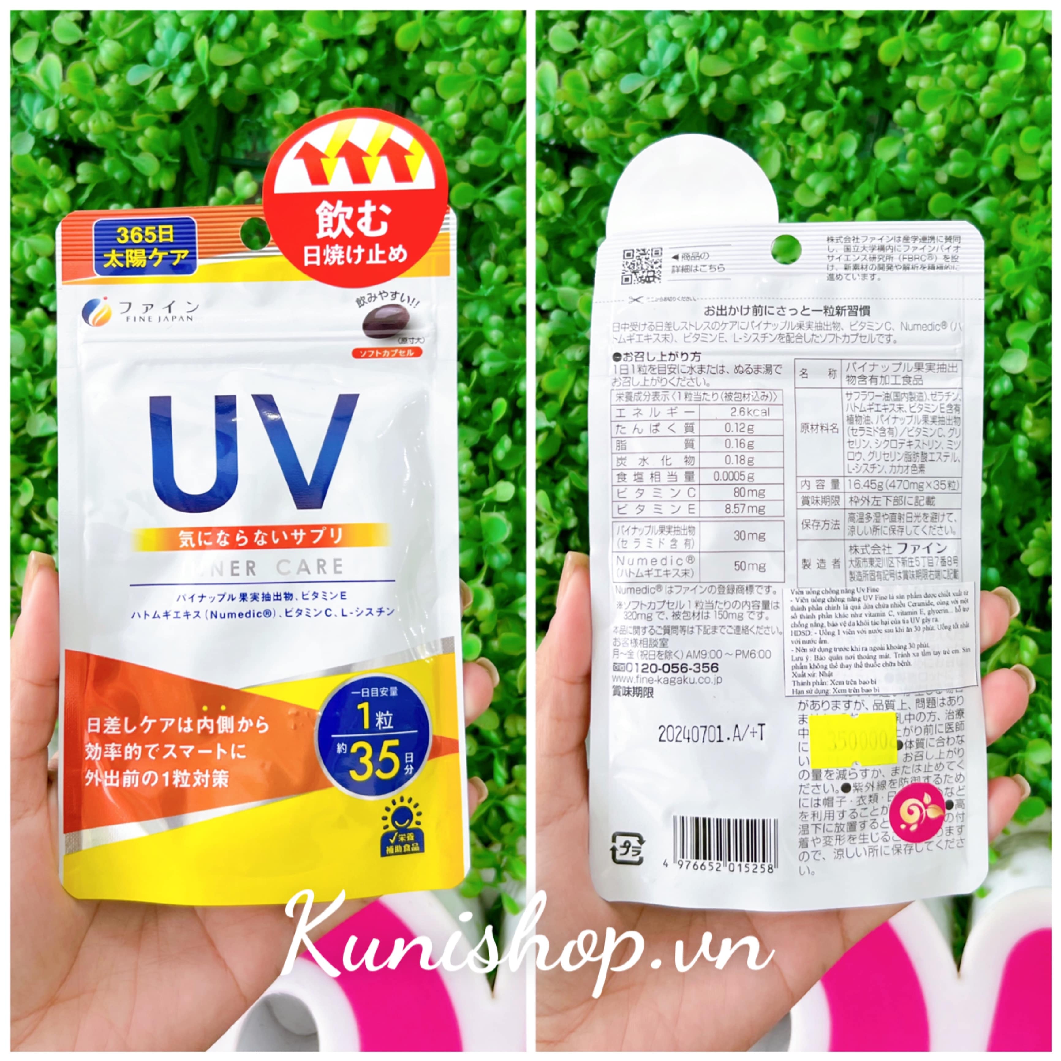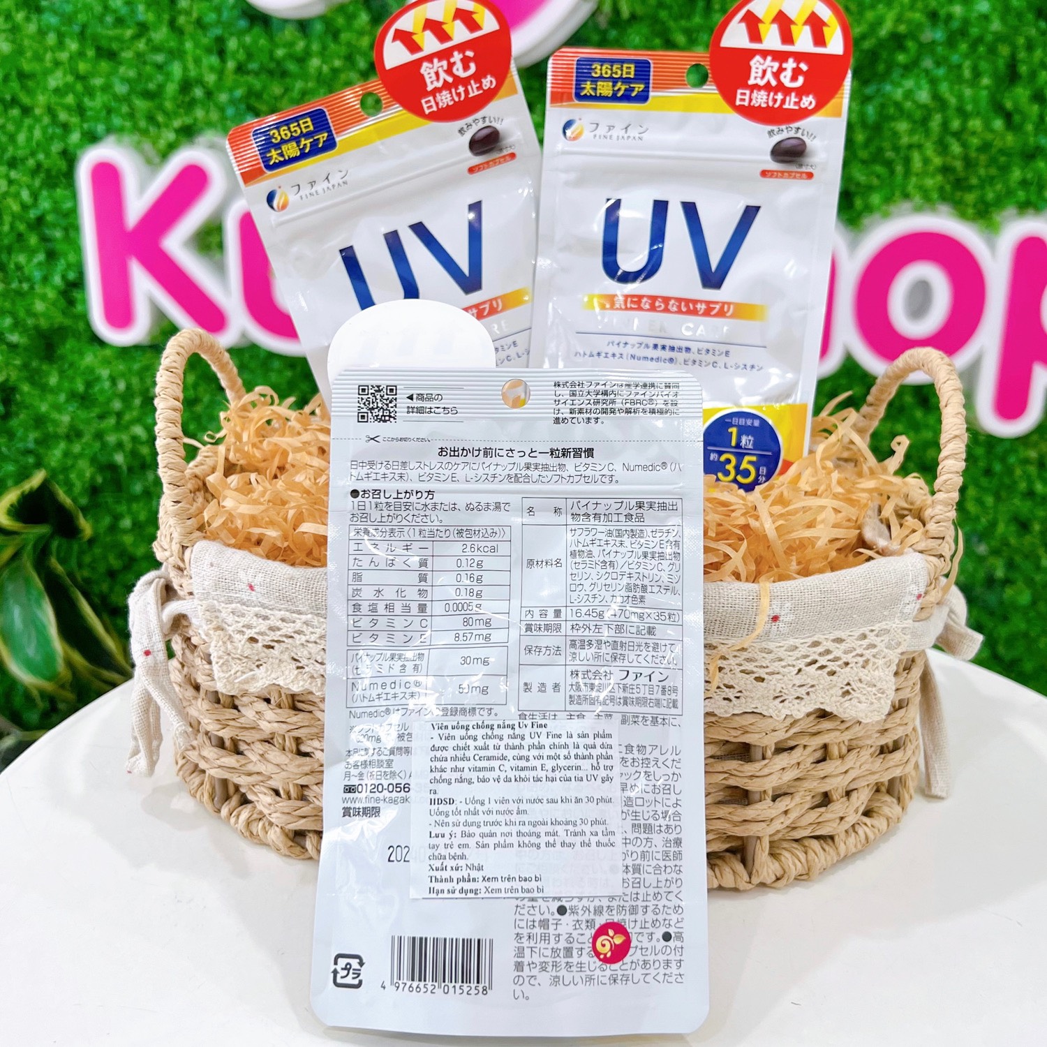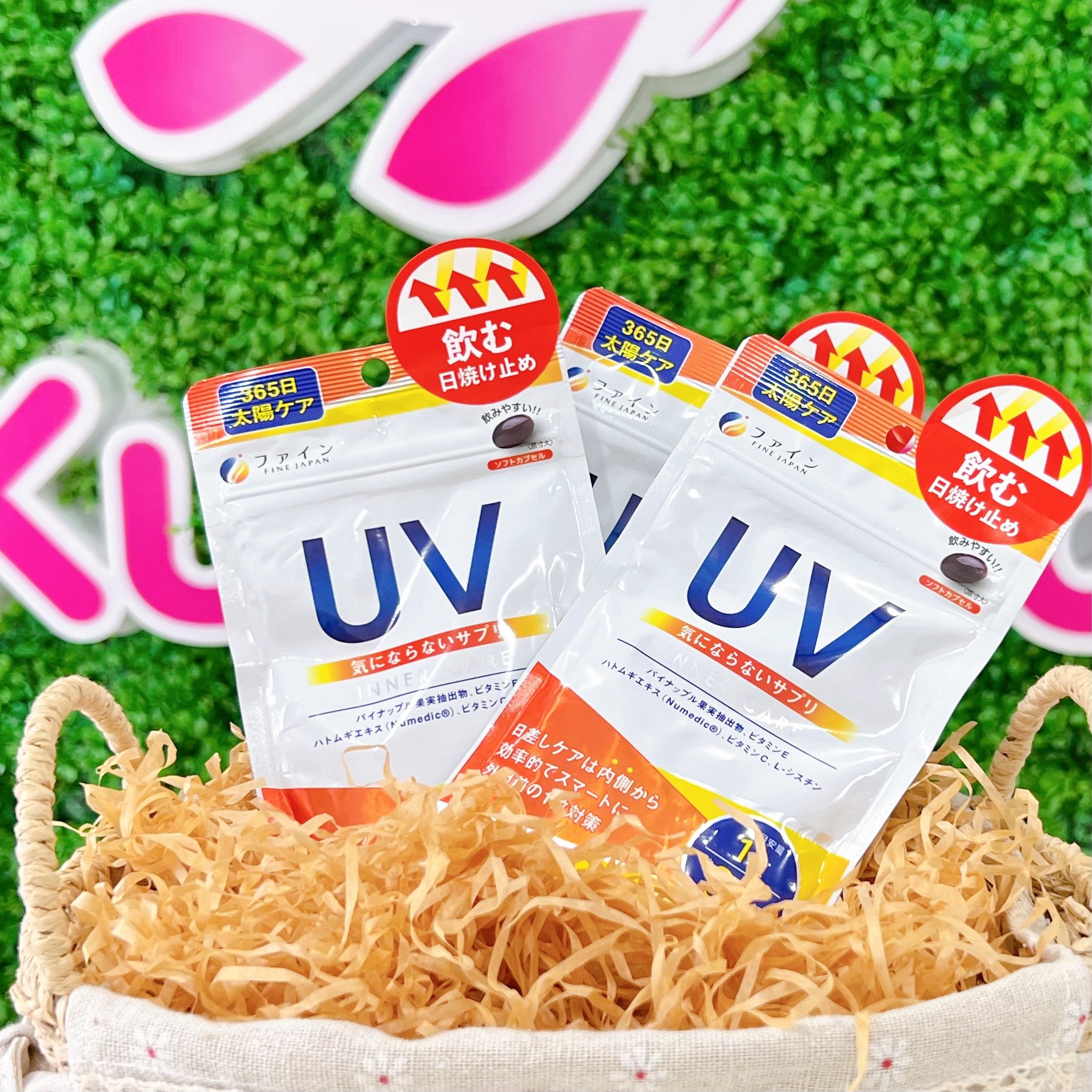 Viên uống chống nắng UV Fine là sản phẩm được chiết xuất từ thành phần chính là quả dứa chứa nhiều Ceramide, cùng với một số thành phần khác như vitamin C, vitamin E, glycerin… hỗ trợ chống nắng, bảo vệ da khỏi tác hại của tia UV gây ra. Sản phẩm phù hợp với người thường xuyên hoạt động ngoài trời, da yếu cần được bảo vệ.