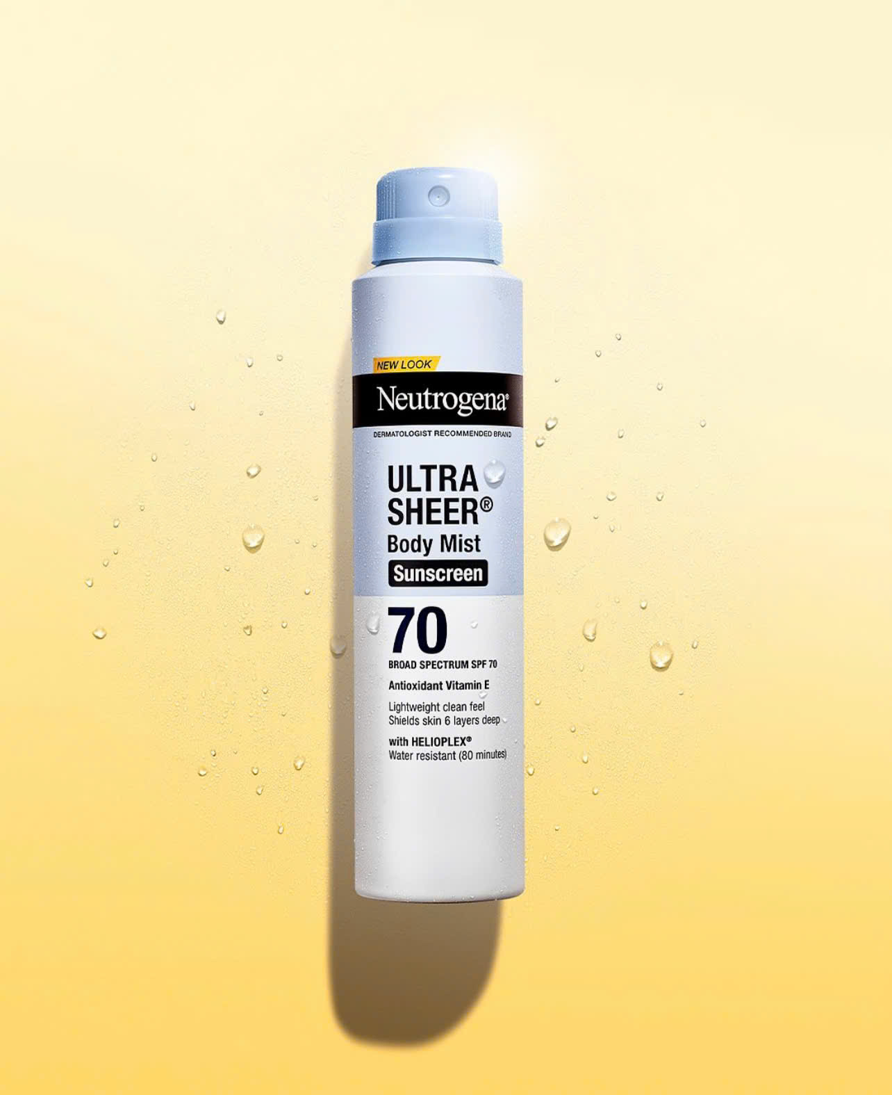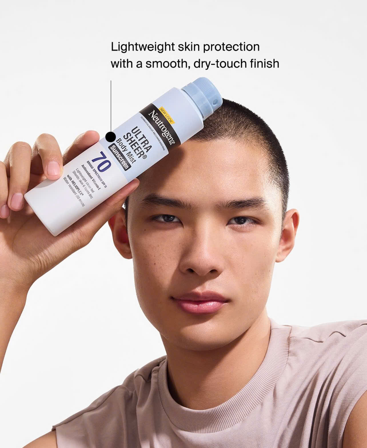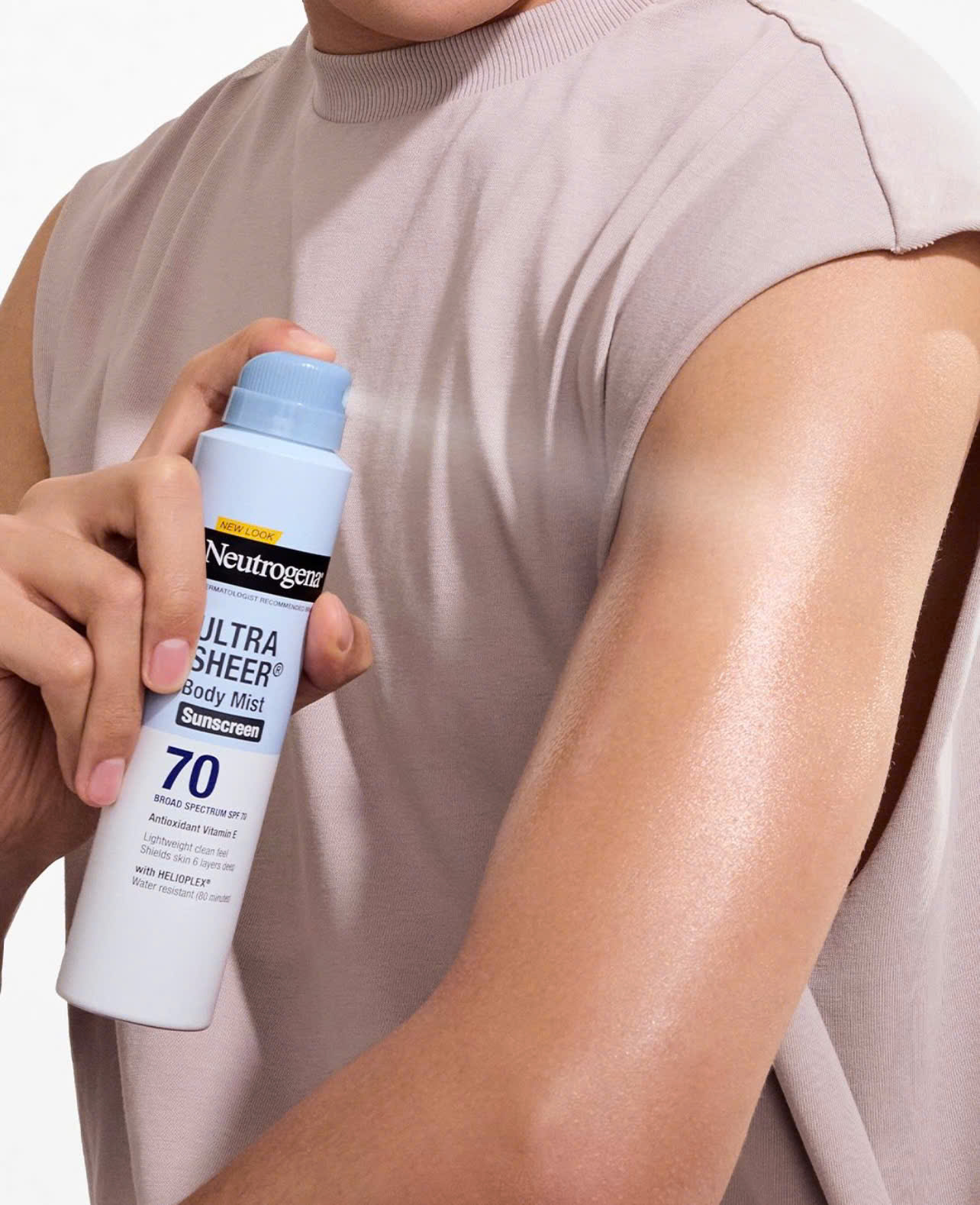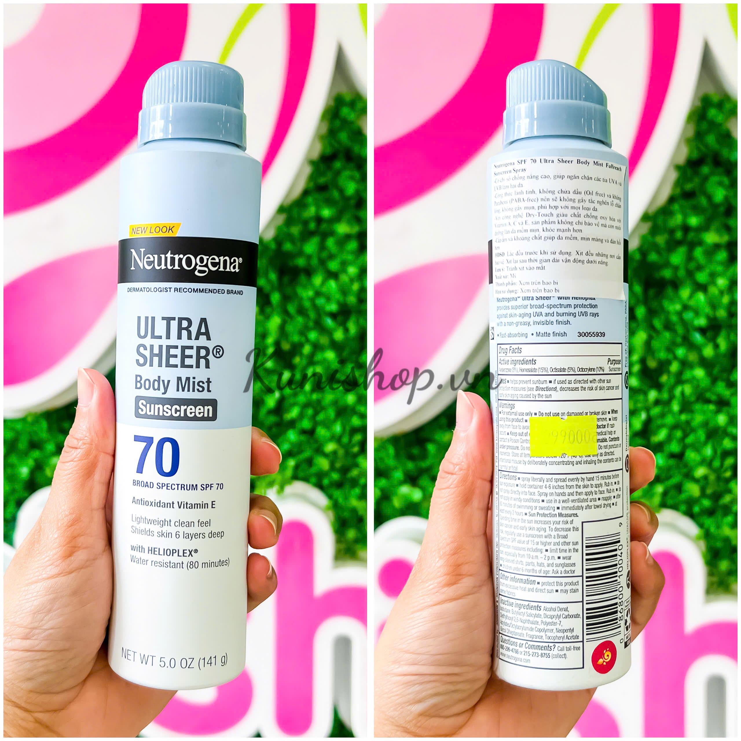 - Xịt Chống Nắng Body Neutrogena Ultra Sheer SPF 70 tạo lớp màng lọc tia UV có độ quang phổ rộng và chỉ số chống nắng SPF 70, chống nắng và bảo vệ da khỏi tác hại của tia UVA và UVB, bụi mịn và các tác nhân gây hại khác ngoài môi trường, ánh sáng xanh từ các thiết bị điện tử.