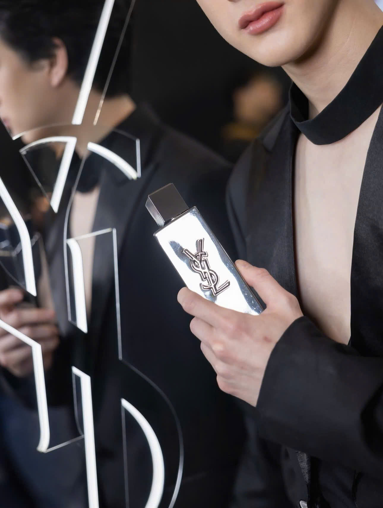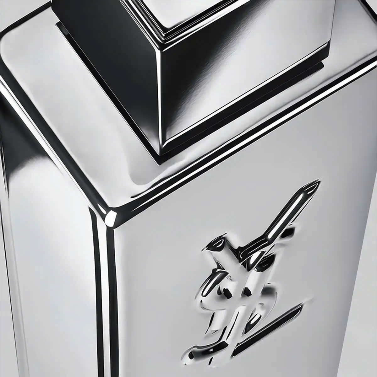MYSLF L’Absolu Parfum khoác lên mình một diện mạo kim loại bóng loáng đầy quyền lực. Tổng thể chai hình khối vuông vức, bề mặt phản chiếu như gương mang lại cảm giác hiện đại, sắc lạnh và đậm chất tương lai. Biểu tượng logo YSL lồng ba chữ được dập nổi táo bạo, đặt ngay trung tâm như một dấu ấn không thể nhầm lẫn.